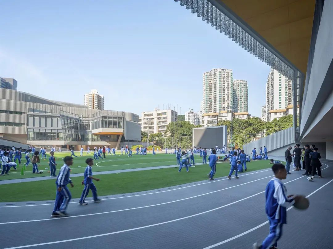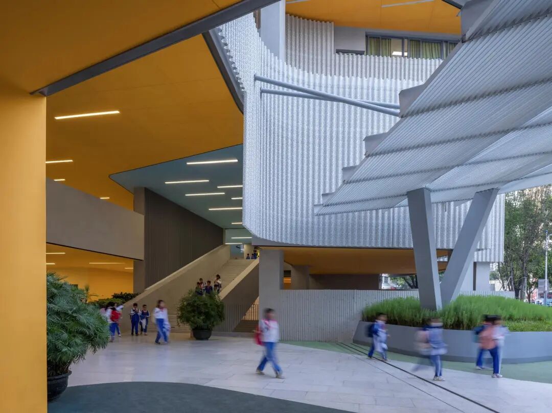 将体量与倾斜的项目布局联系起来,创造了一个动态的梯田形式,将景观从地面延伸到学校的屋顶。动态的外部景观为儿童和游客增加了额外的细微差别,同时促进了外部的功能性区分。