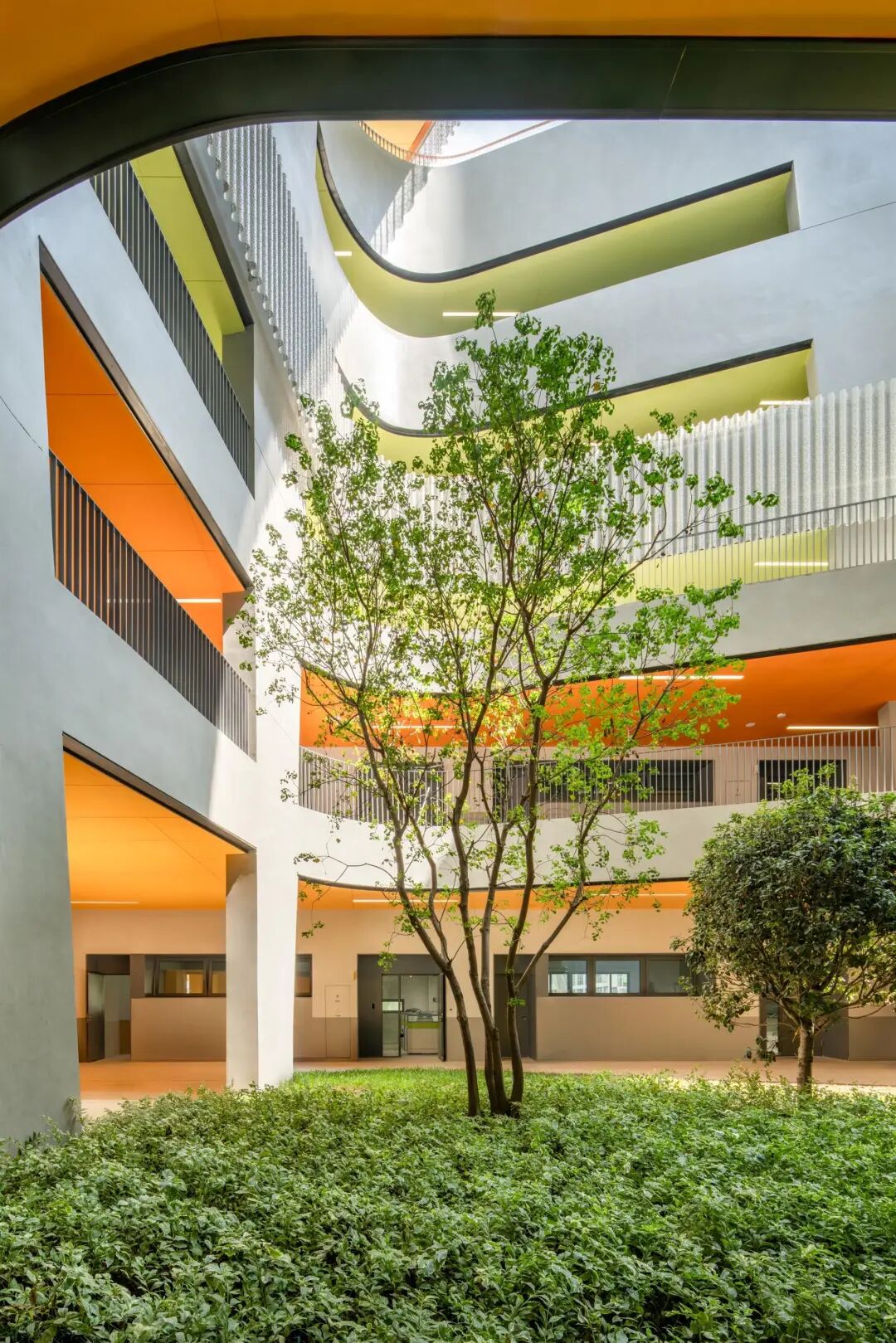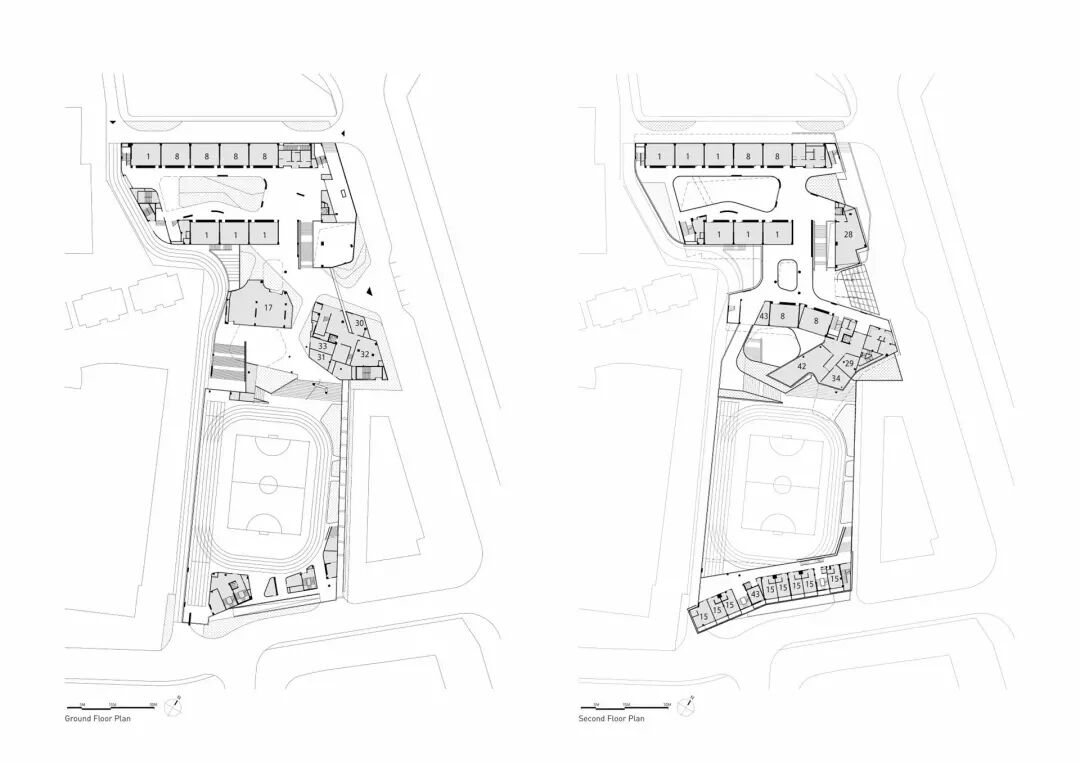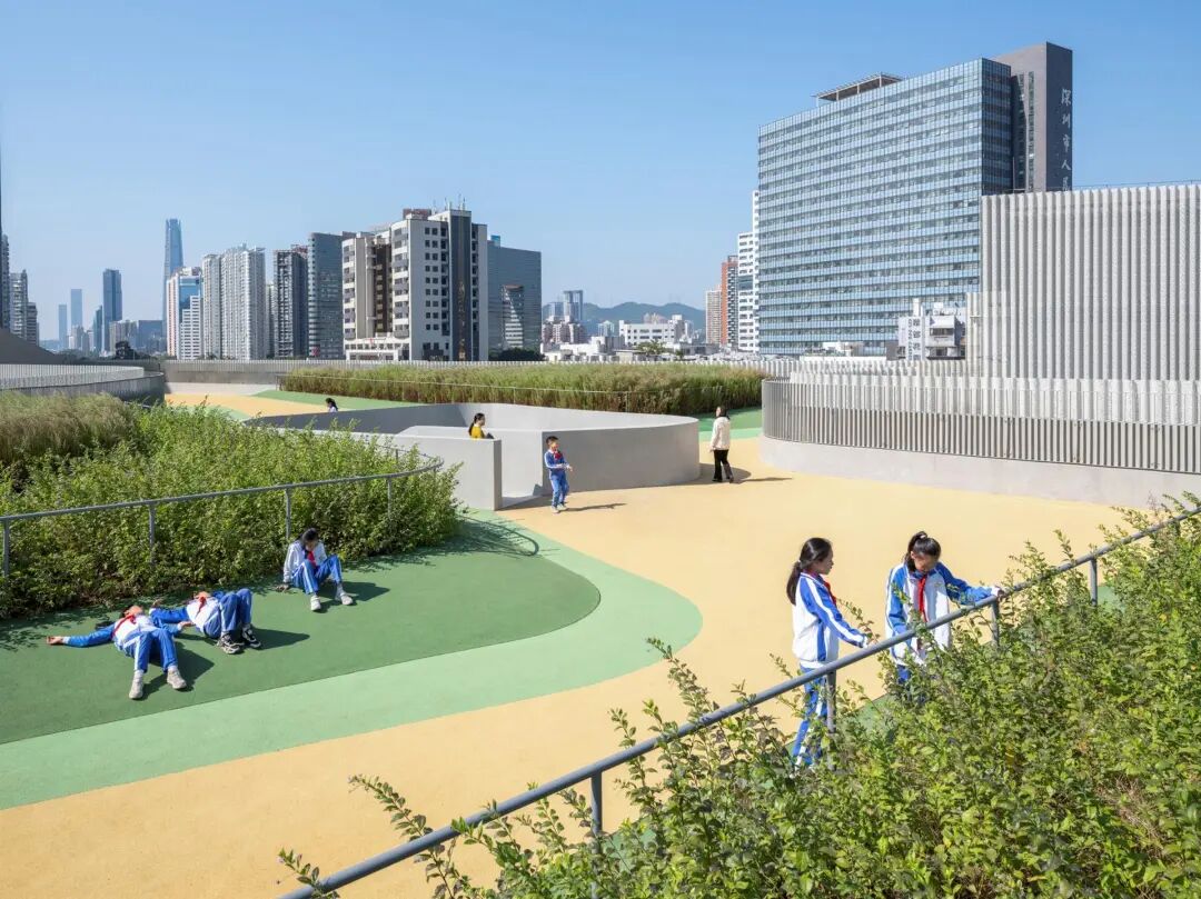 六个庭院从体量中雕刻出来,以回应和扩展周围的环境,并将光线和新鲜空气带入学校的每个角落。一系列的屋顶露台上种植着郁郁葱葱的植物,将自然回归校园,并以美丽的第五立面(屋顶平面)奖励城市。