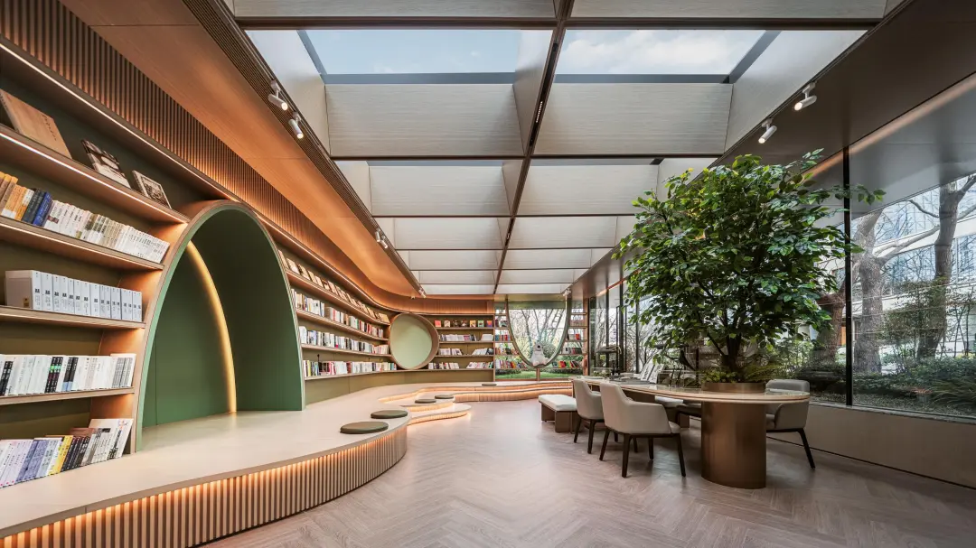 园林中间的水上中信书屋,也极具网红气质。九庐在园林的水景之上,设计了一处独立书屋,像一个漂浮的水上盒子,室内的设计也非常强调光影,来到这里的第一感受就被震撼到。