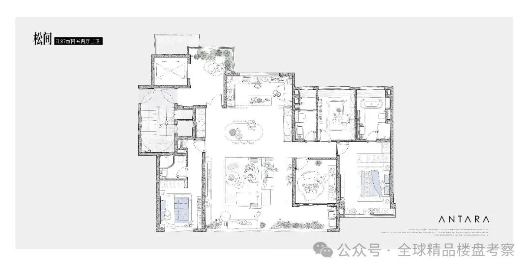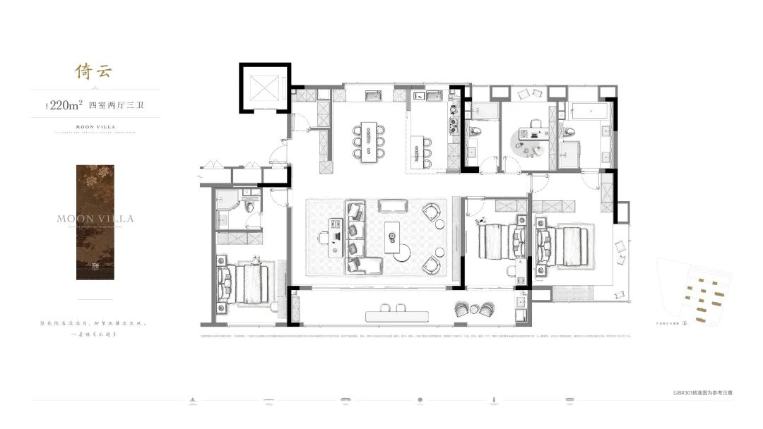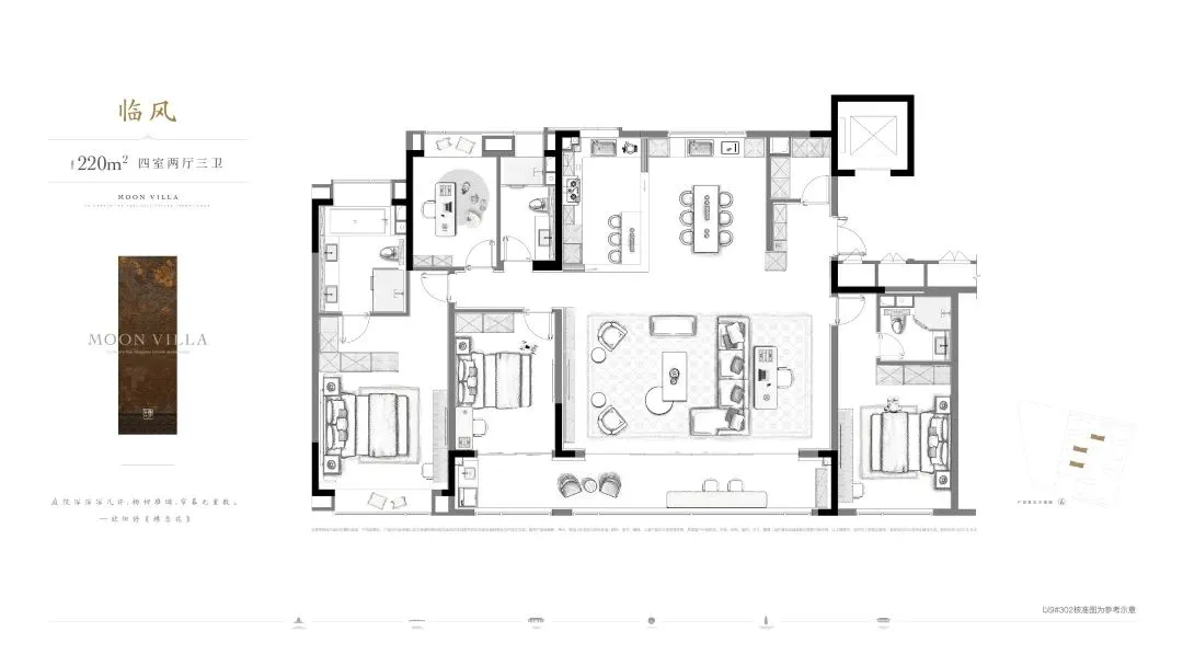 建面约220㎡四房两厅三卫户型:约8.5m横厅空间,人生阔境,由此而起。约11.8m跑道式奢阔阳台设计,将尺度感拉满。主卧套房配备270°转角飘窗,一城美景尽收眼底!