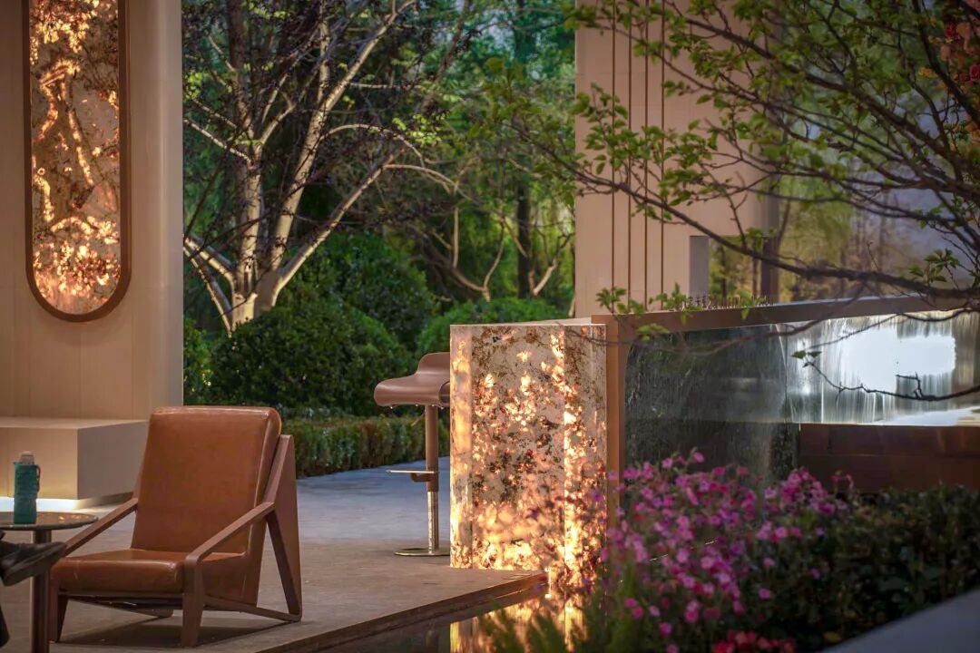 水幕沿经奢石竹简流淌,演绎“树影流淌,清音入水”的景观场景。将古简的厚重、奢石的华贵与跌水的灵动融为时空对话,使居住者在移步换景间,既触摸兰州文脉的温度,又感知了现代设计的锐意创新。