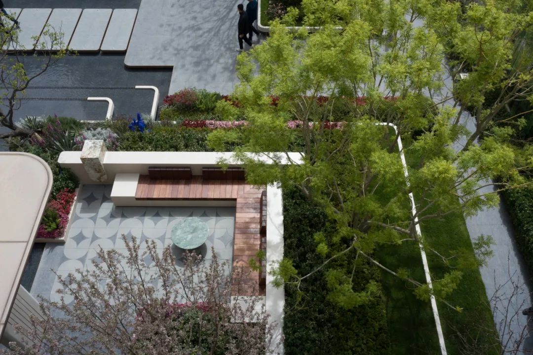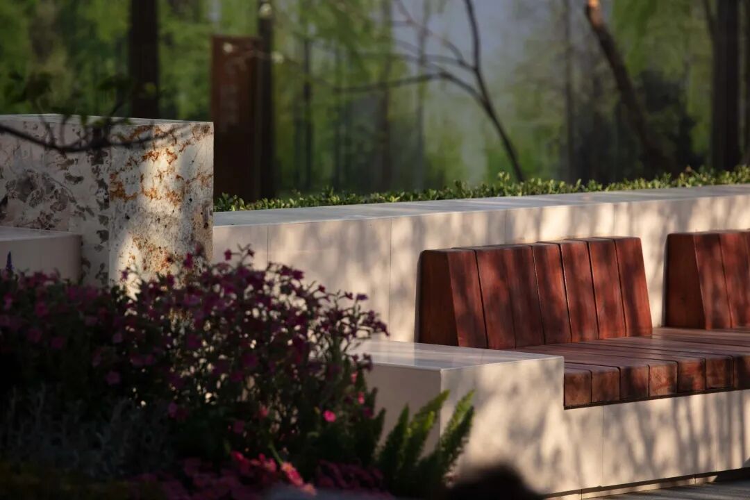 型木质座凳被花池温柔环抱,绿植间阳光流淌,茶盏轻碰时商务会友与闲适休憩相融。