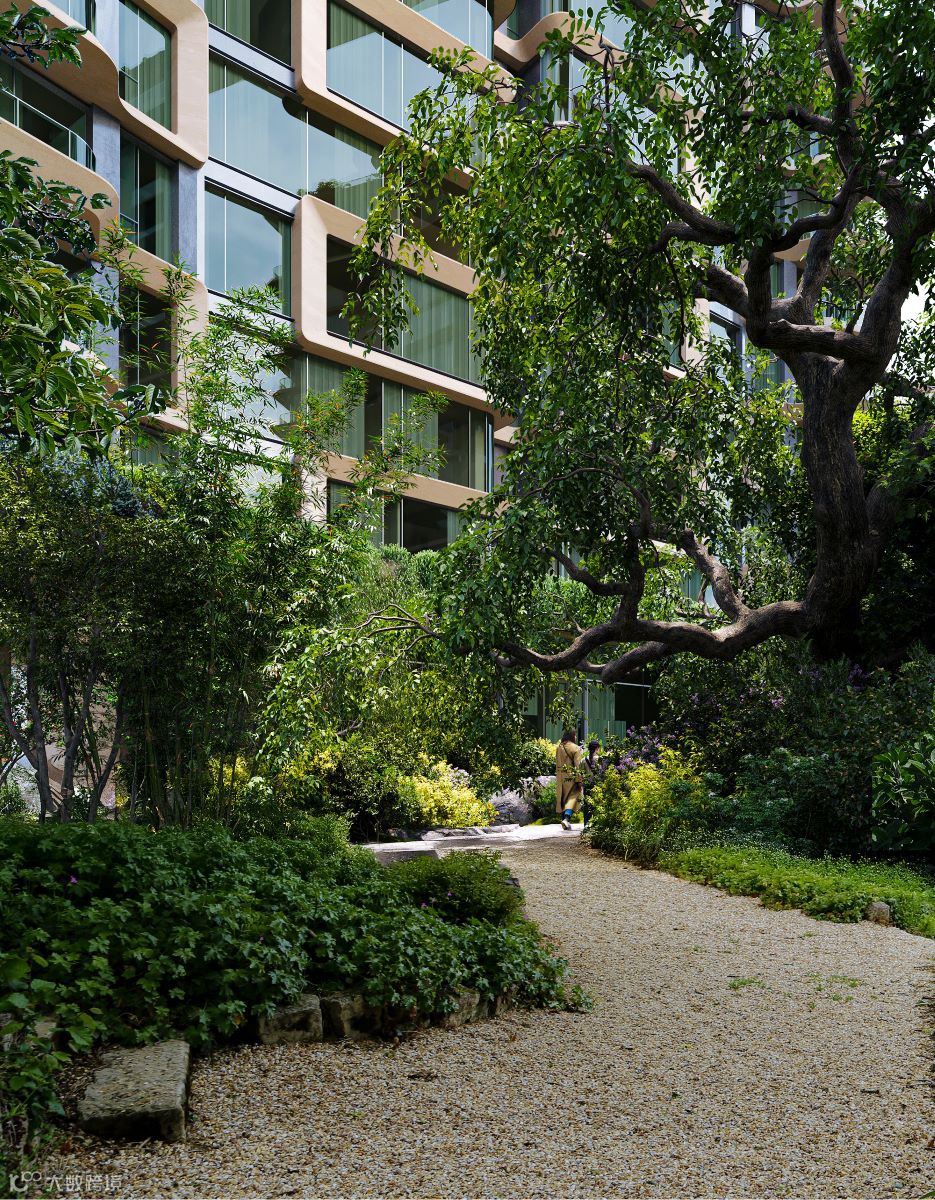 下沉庭院的设置,将地面光影与植被引入地下活动空间,并通过坡道与景观台阶,柔性衔接中心花园与架空层花园,使得绿意无界渗透,为入口大堂及邻里交流区带来微气候的调节与松弛氛围。