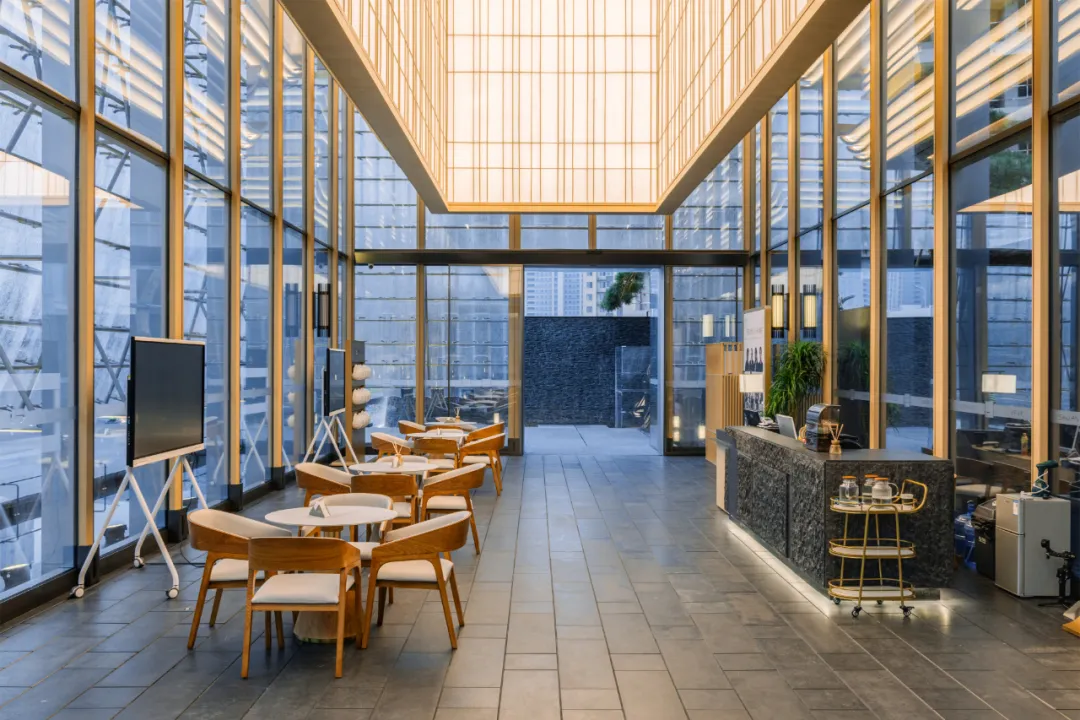 玉门内部,内藏精致木构,通过艺术形体重构一个木构建筑,营造出一个内有乾坤的空间体验。大堂包括长桌等候区、大堂服务区,灯光从木构缝隙中渗透出来,中心区域设置通高灯箱,加强大堂的仪式体验。
