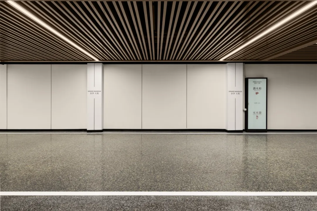 行车道采用古铜色铝格栅吊顶,可持久保新。灯带藏在格栅吊顶中间,精致到细节之处,提升尊崇感。