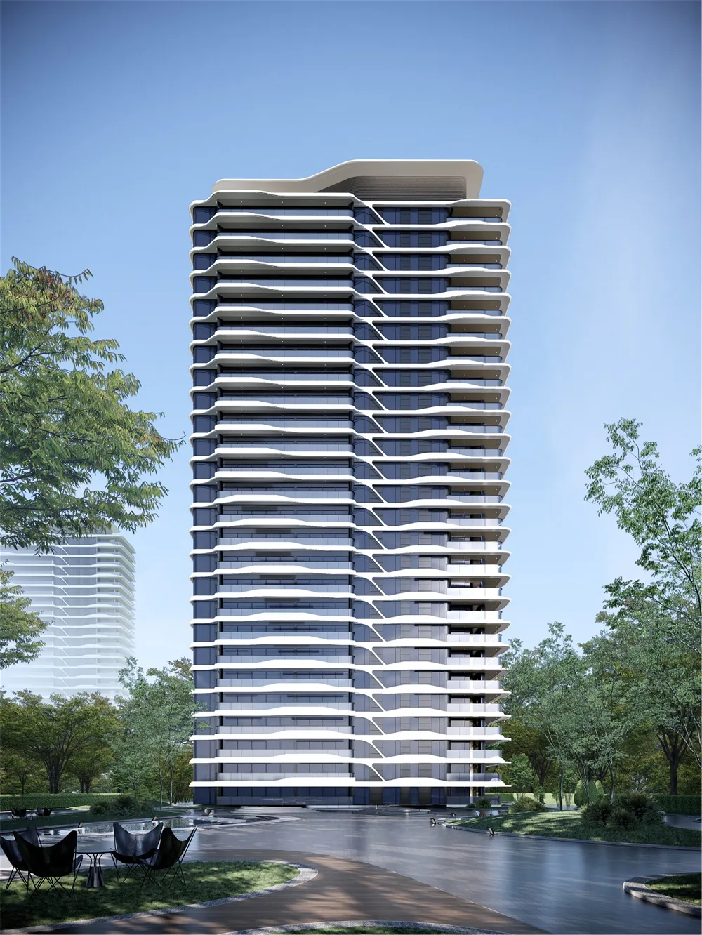 项目高层立面设计上,以曲线为“引”,自下而上生长的线条交错、融合、延伸、无边界,最终在三维尺度上形成“超流线”,呈现出流畅而富有张力的曲线序列。