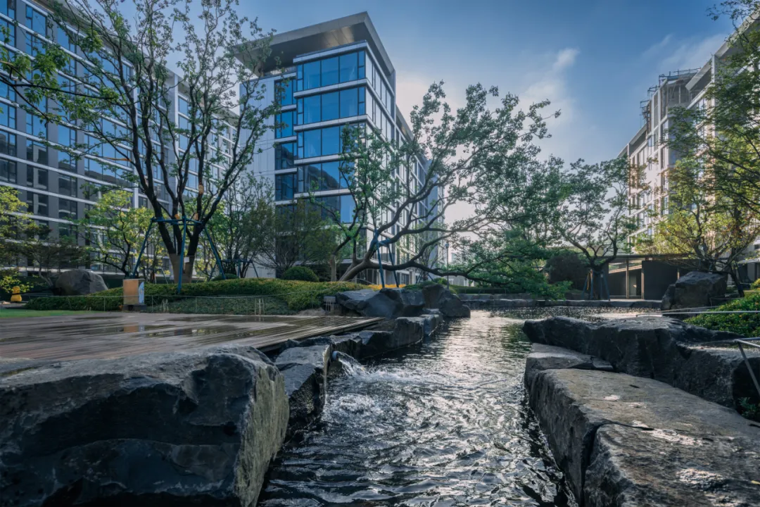约百米水瀑界面,延城市界面创造约百米流水墙,潺潺流水引导住户进入园区,使归家动线沉浸在林瀑之间,洗涤城市外界的纷扰。