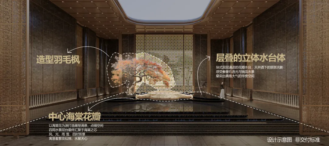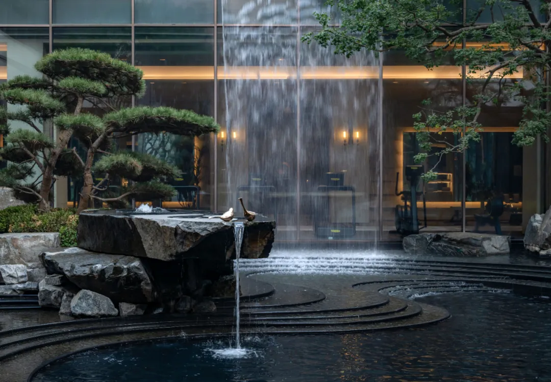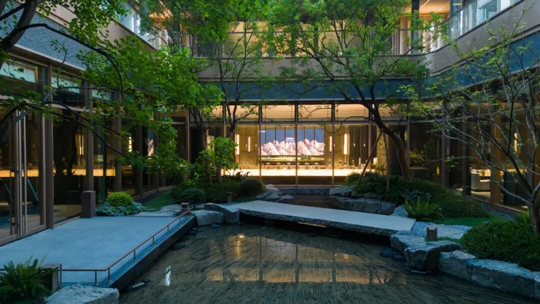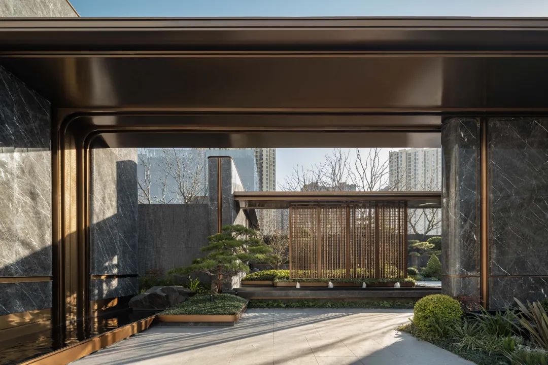 侧入的入口形式将归家动线隐藏在转折院落之中;对外是高墙和奢石质感所带来的品质体验,对内是繁乱都市穿梭到自然院落的心境转换。三处庭院也独具特色,围绕凤栖曲水展开故事。