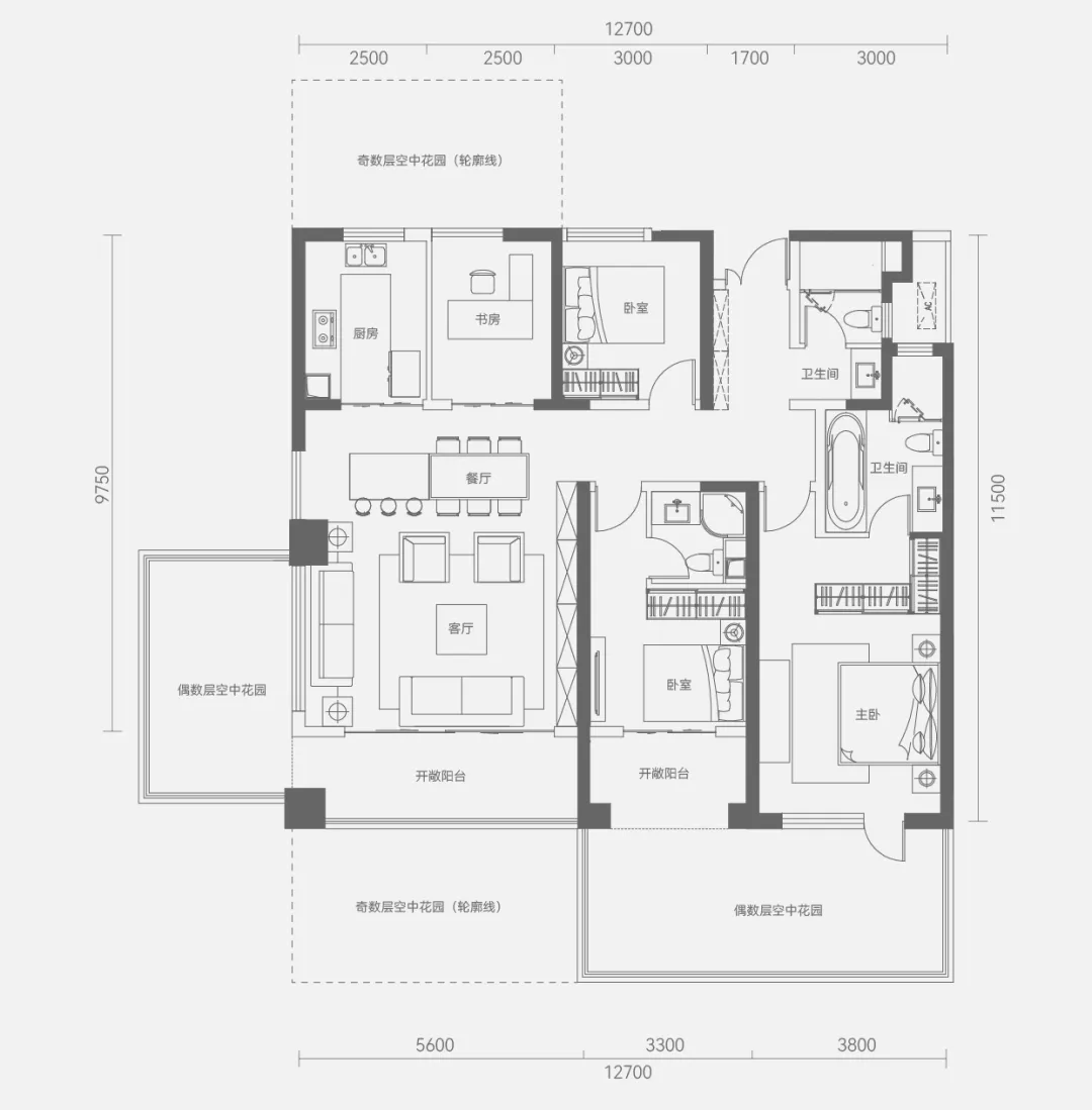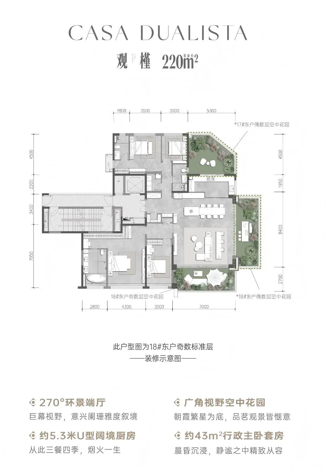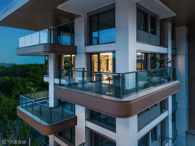 入户双重仪式感,以及南北向大横厅,还构成了“全屋半厅”,再加上“双端厅”270°瞰景,两种方式步入露台,空中院落临空而立。