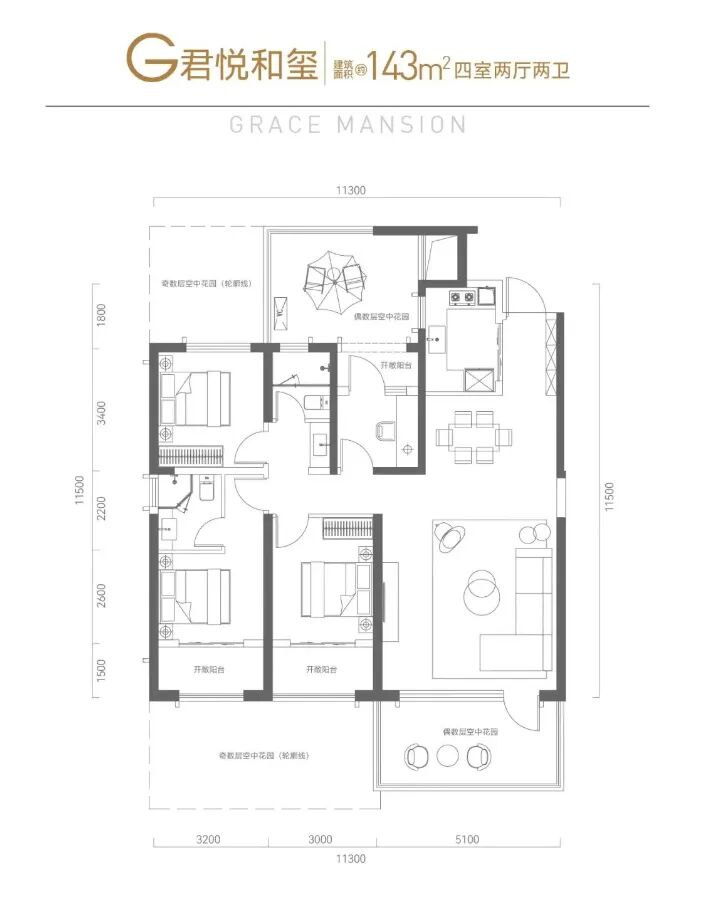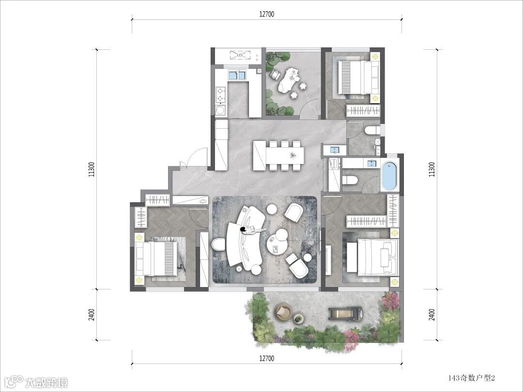 比如建面约143㎡户型,整体尺度上十分考究,先来感受一组物理数据:南向4开间、约15米面宽、约11.5米露台、270°IMAX超级视野、赠送面积约44㎡左右、得房率约114%,完全做到了比肩建面约180㎡的享受。