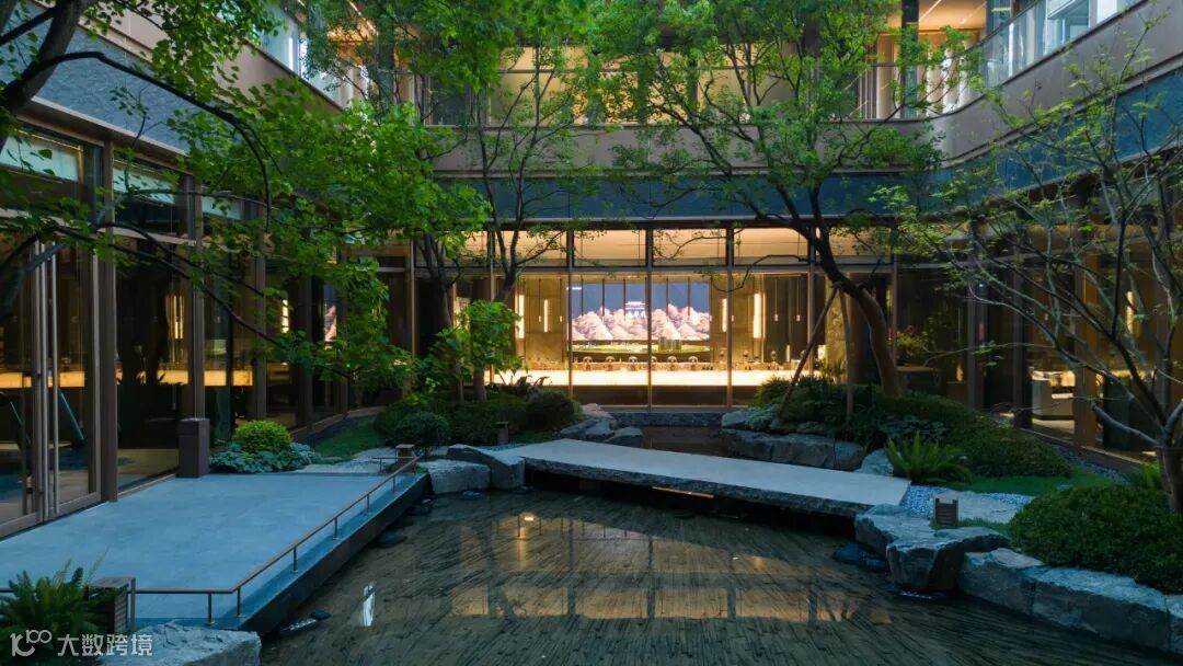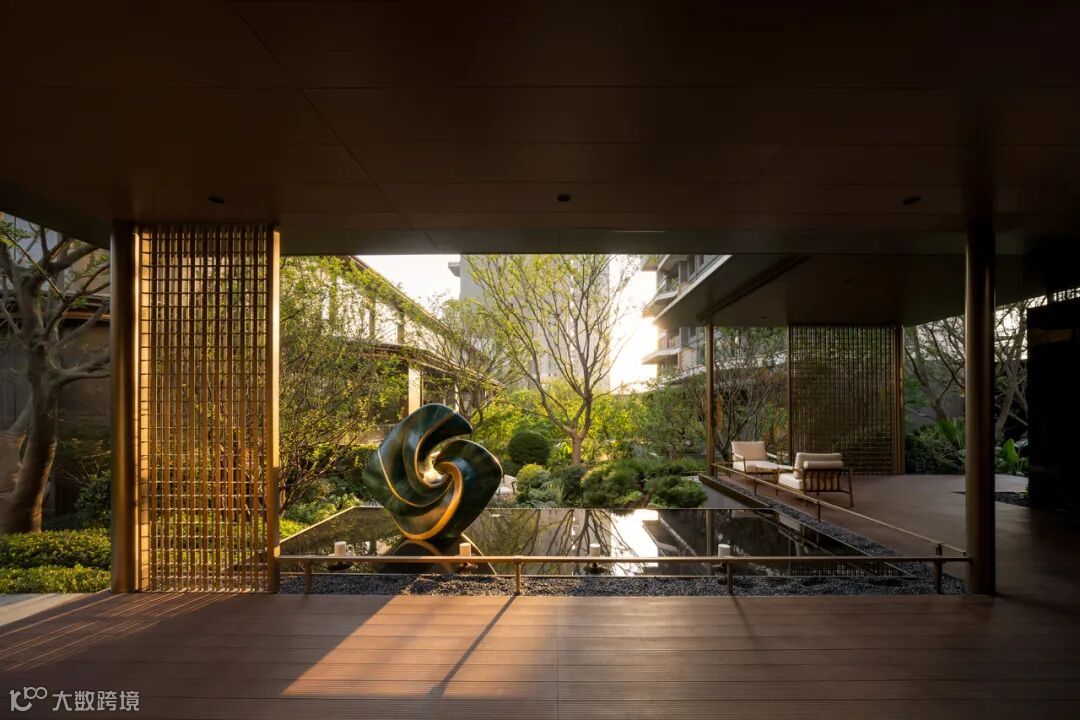 经过泗水归棠,便步入了第三重空间,约800㎡下沉式水院,从西安丝路文化及案名logo中提取曲线元素,用立体思维打造高低错落的度假感场域,浅浅一池,波光粼粼,四周的回廊与建筑都仿佛漂浮之上,具有浓郁的轻奢气息。