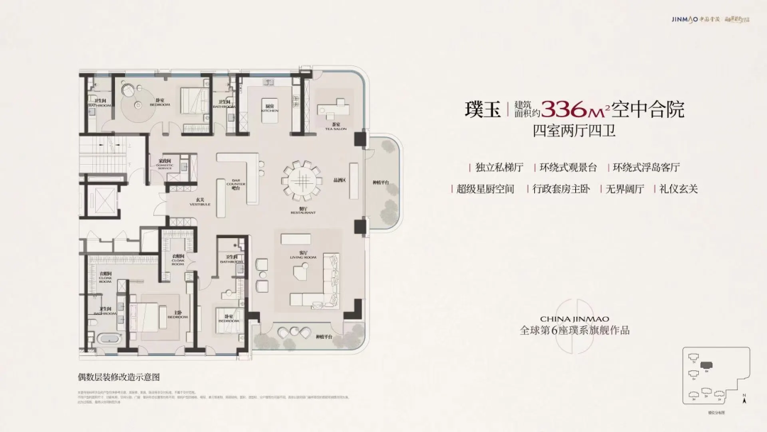 金茂璞逸东方主力产品为229-269-336㎡,其中269㎡、336㎡为全景舱设计。