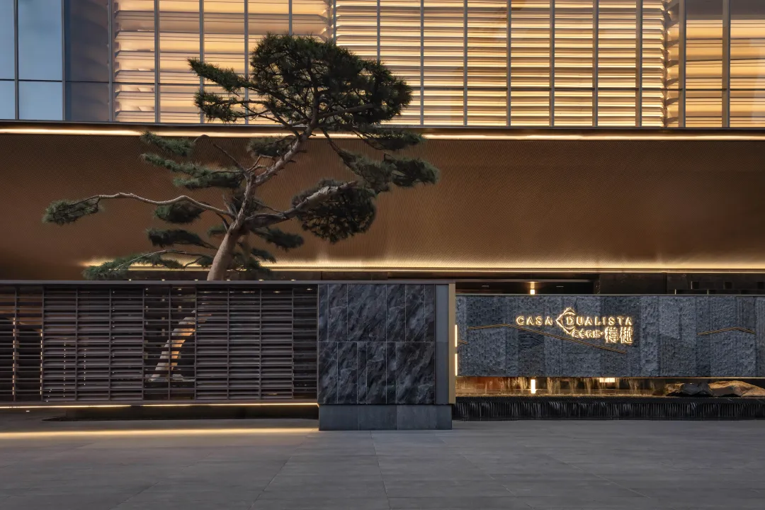 归家序章以约300米景观长卷开启,大门建筑运用仿木构金属,以简练线条勾勒唐风骨架,鎏金铜色与深灰石材相映,既显尊贵气度,又暗含刚柔相济的的东方哲思。