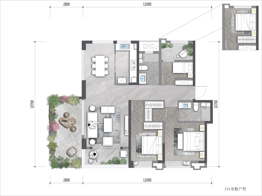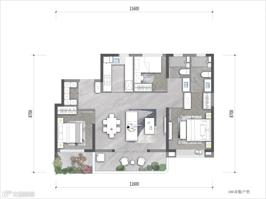 建面约106㎡户型,也做了四代宅,小面积也能享受“空中院落”。