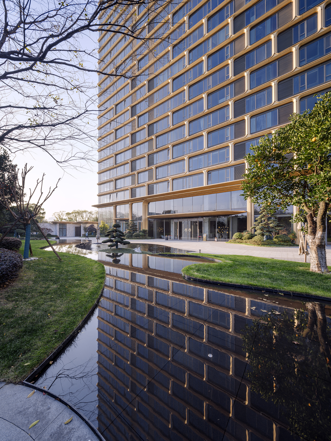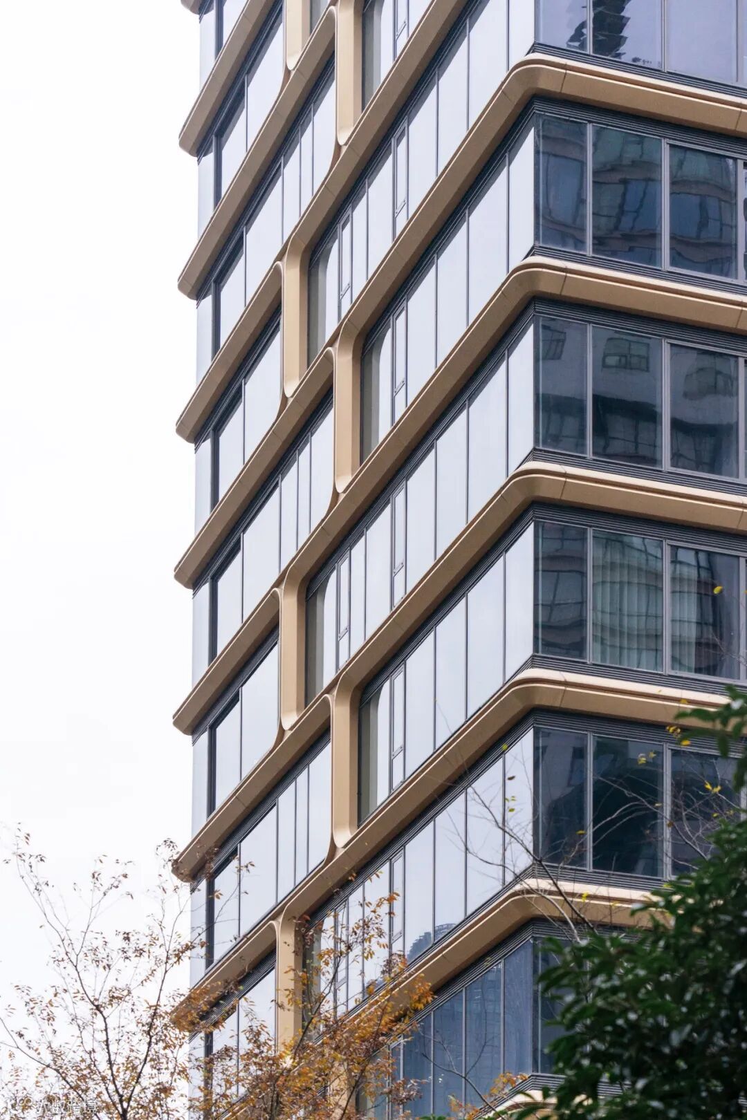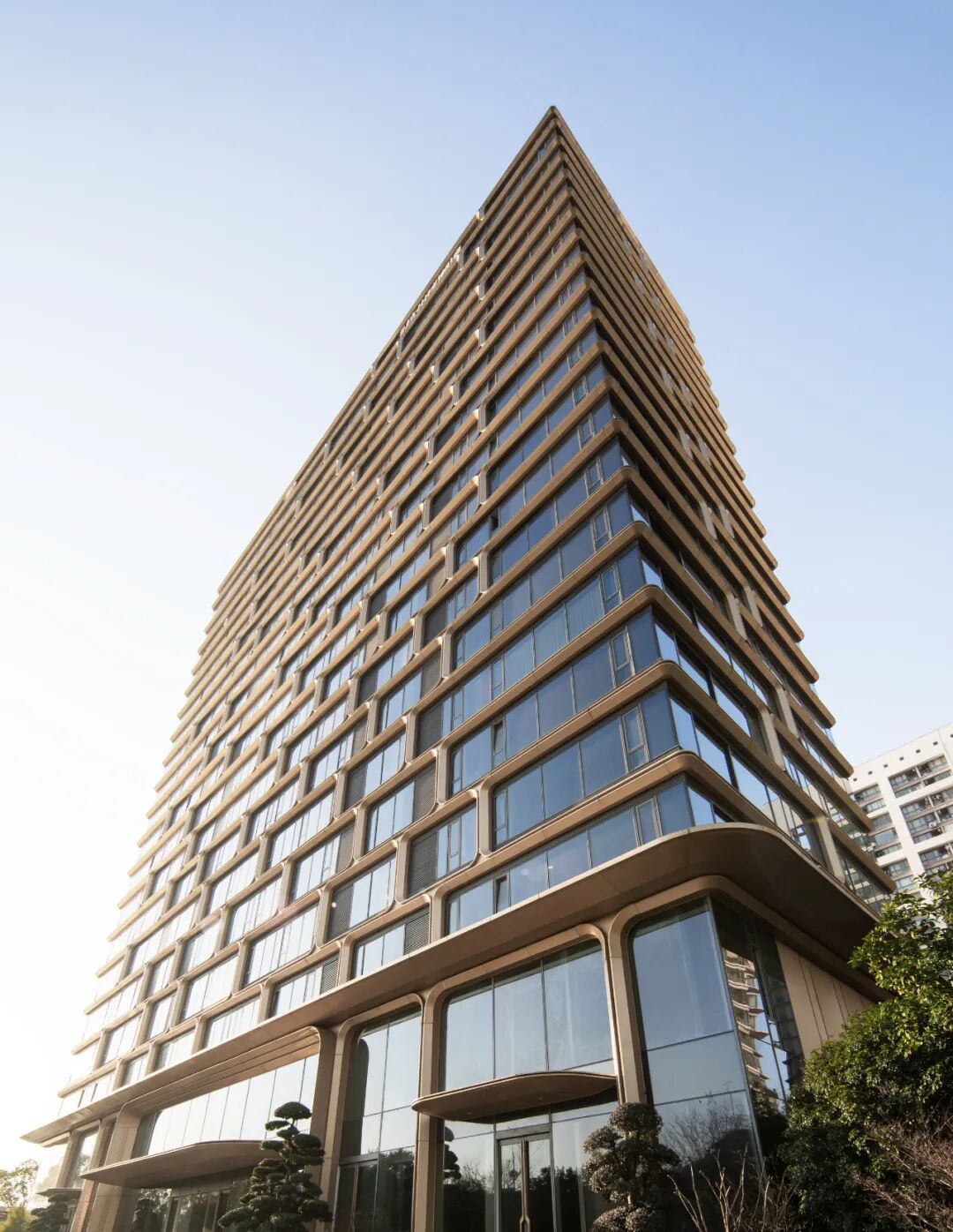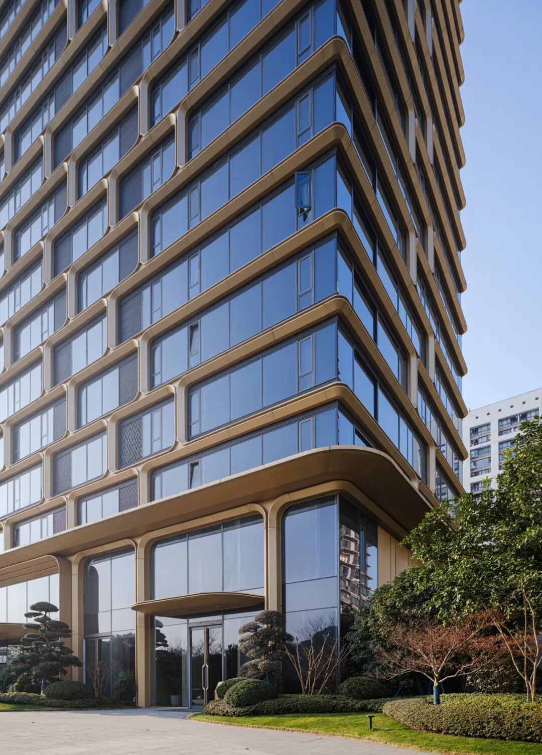 以“潮涌”为意象,立面设计提取钱塘江水的流动节奏,抽象为层层律动的香槟金色曲面铝板与大面玻璃系统交织的建筑语言。