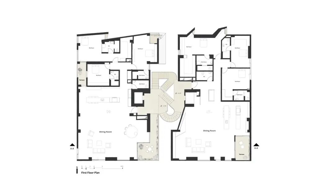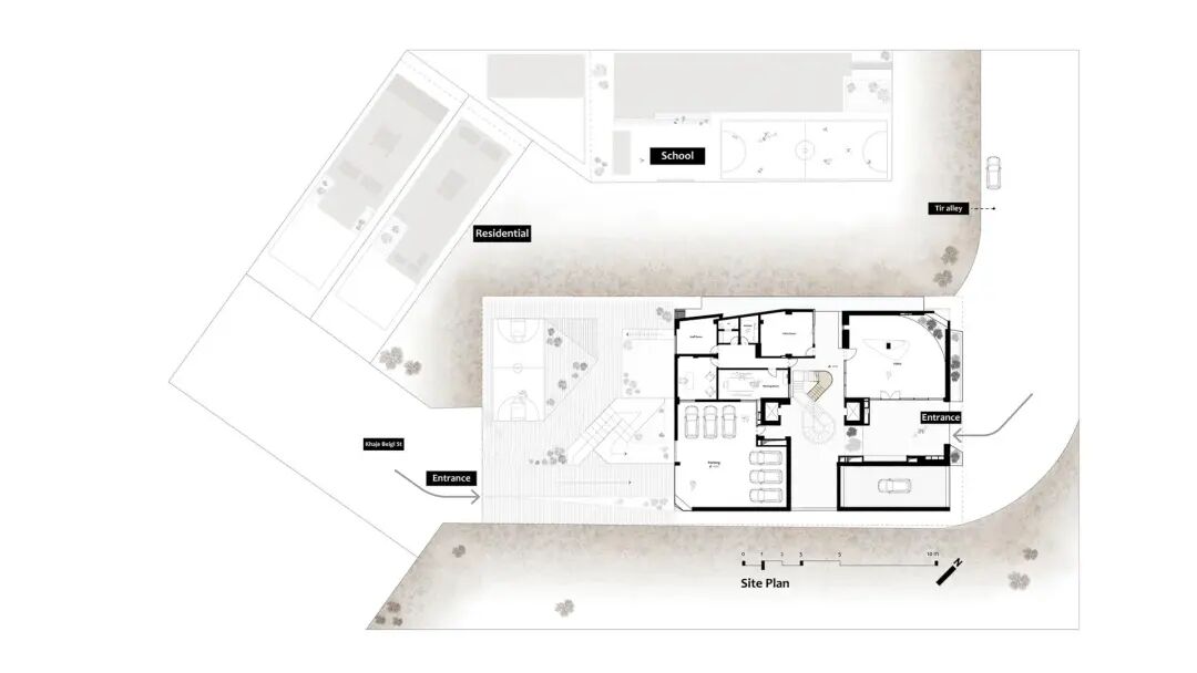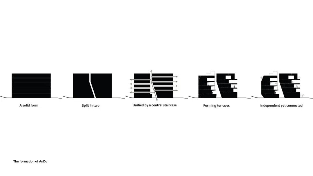 安藤项目——字面上翻译为波斯语中的这两个——是在填充地块上创造新型住宅的尝试。通过释放流通,并将其与露台、入口和院子的开放空间混合在一起,每一层的两个单元都变成了一个充满活力但又平静的住宅综合体,每个单元都保持独立,同时在连接这两个单元的有趣楼梯的帮助下参与永恒的舞蹈。两个同步的体量和似乎卡在中间的楼梯创造了多样化的空间序列,并与它们的开放空间相结合,就像一个三维长廊。