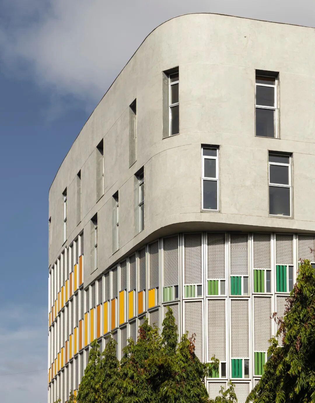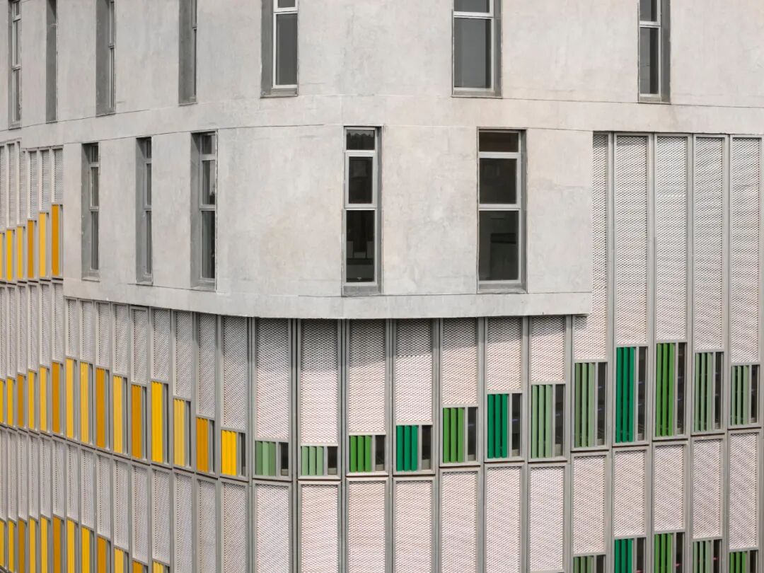 从结构上看,电梯井和另外五根柱子支撑着大楼。坡道悬挑在一根倒梁上,倒梁在不同高度与每根立柱相连。在上层,大楼外缘又增加了一组柱子,并设置了一个转换层,以便在将来大楼扩建一两层时,可以在上面建造无柱大厅。第五层的内外两组柱子可作为学校的多功能空间。材料饰面尽可能保持简洁、低维护和天然--天然石材地板、硬木内部玻璃框架和枢轴鳍片,外墙主要采用阳极氧化铝。颜色构成了一个重要的导向装置,坡道栏杆等元素的颜色会随着楼层的变化而变化,外部鳍片的颜色也会随着建筑的每个面而变化。