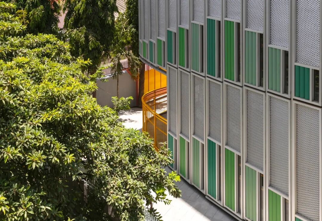 与城市之间的联系是以儿童的尺度来衡量的。沿着坡道的外沿,一个低矮、有遮挡的开口忽高忽低。这些开口不仅可以最大限度地减少中午刺眼的阳光进入建筑,还可以作为一个小窗口,让孩子们可以眺望城市,或向街对面的父母挥手致意。