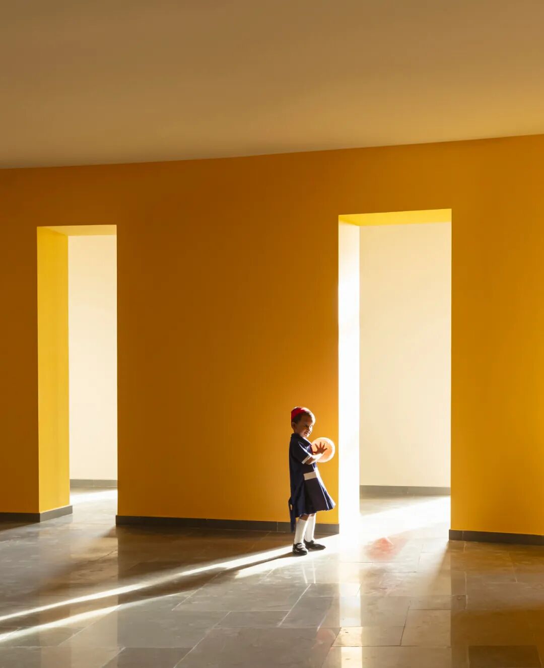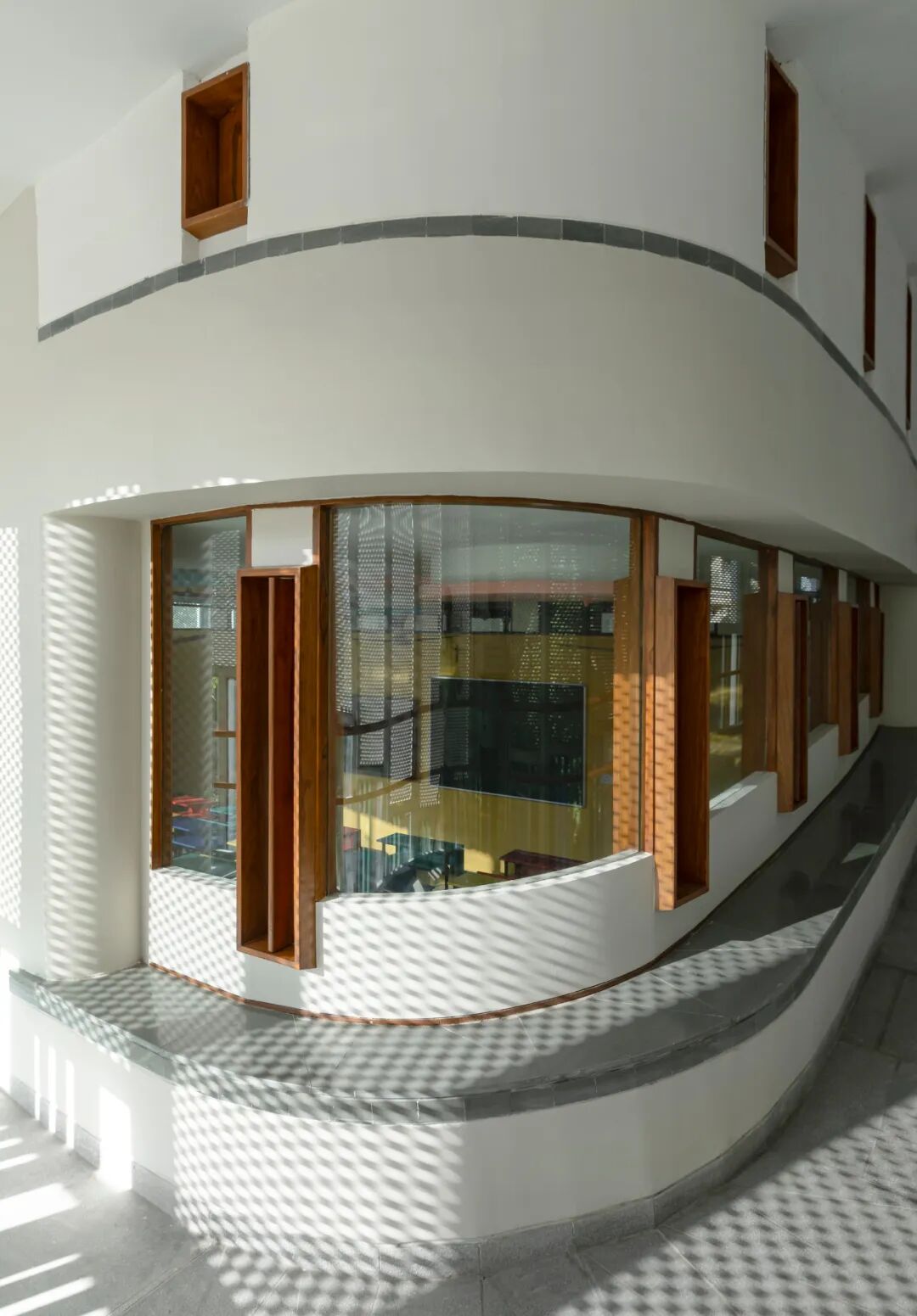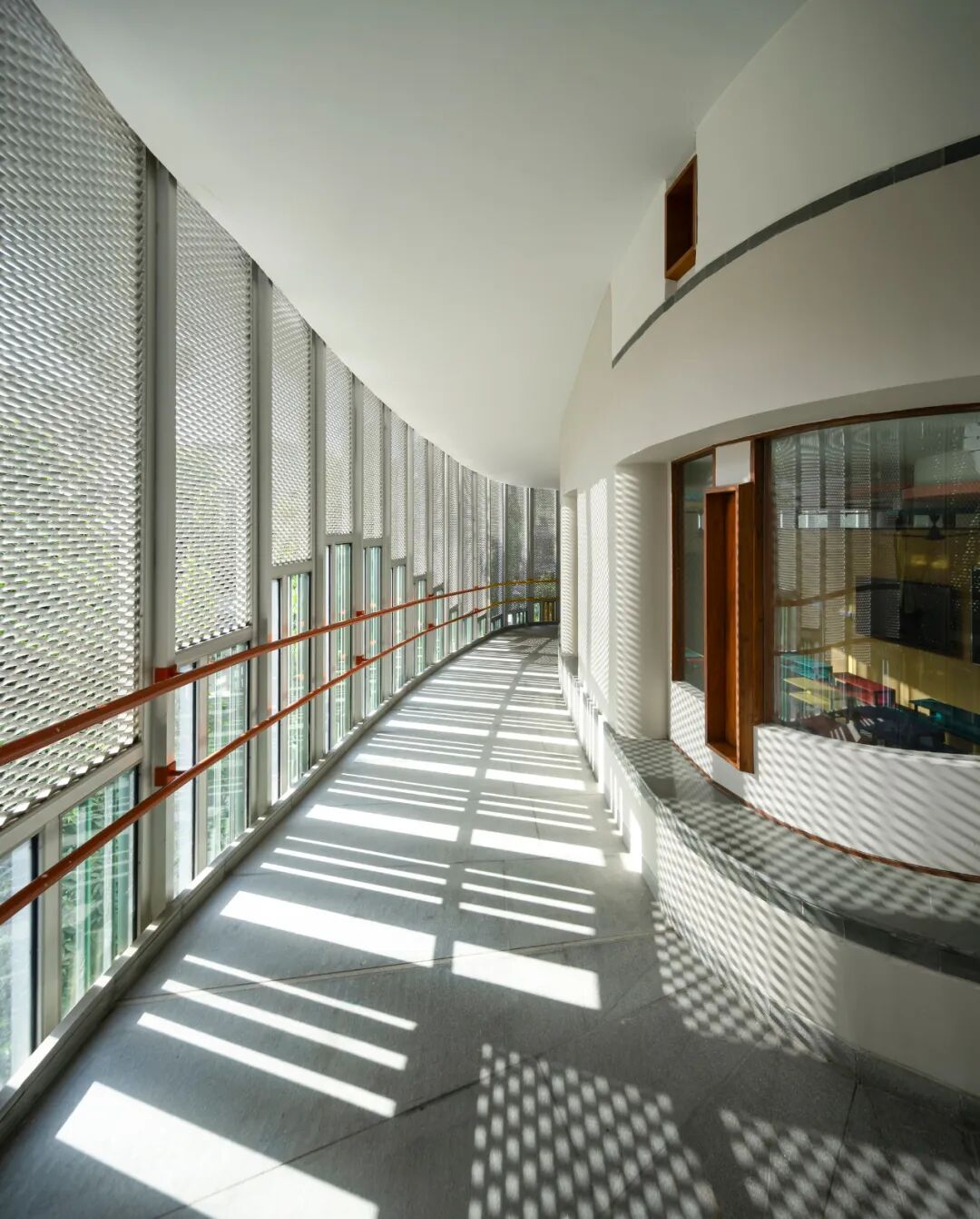 Connection with the city beyond is measured and at the scale of a child. A pattern of low-height, screened openings rises and falls along the ramp's outer edge. These are calibrated to minimize the entry of the harsh mid-day sun into the building but also serve as little windows from which children may have a view of the city or wave out at their parents across the street.