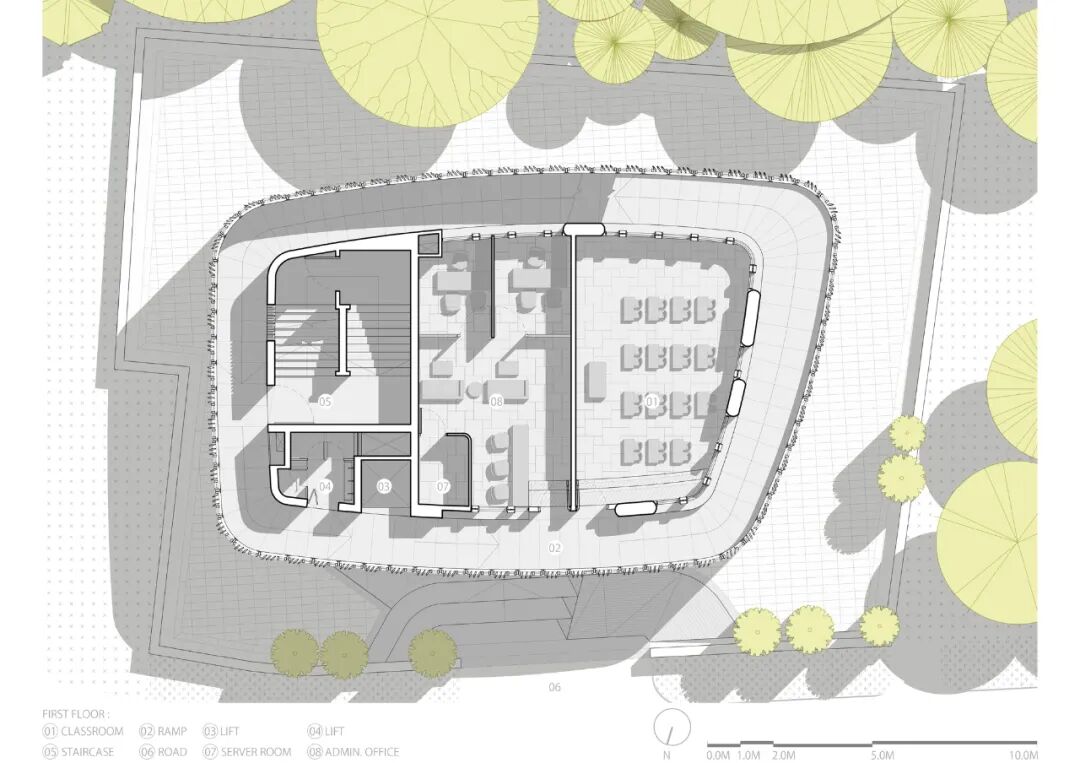 教室坐落在从楼面平台开始的凹陷处。沿着楼板外围的倒梁使整个楼板有一个整齐的檐口,外围的梁形成了教室的自然边缘。边缘的宽台阶可用于戏剧或舞蹈等活动,并与高台相连。进入教室后,城市就变成了一个幽灵--光线和形状透过坡道边缘的穿孔金属网,街道的声音被抑制,学校的声音占据了整个教室。坡道作为 “内部街道”,成为教室内的孩子们与 “外部 ”互动的场所,他们在玻璃幕墙上展示自己的作品,或在朋友经过时向他们挥手致意。