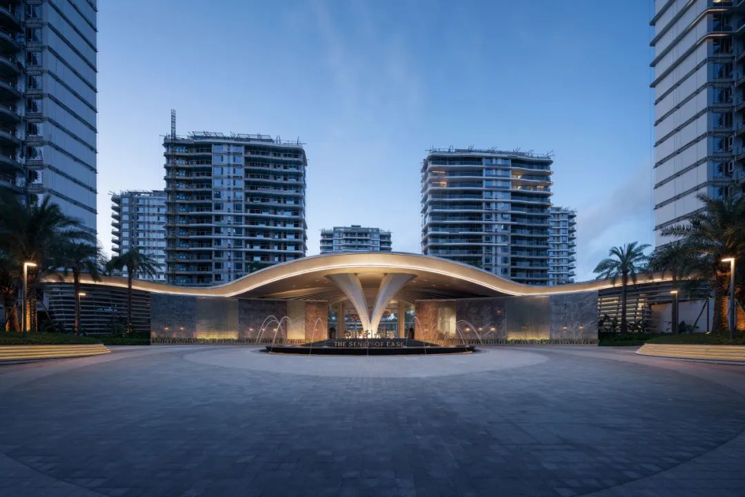 在社区大门的设计中,我们运用了流畅舒展的曲线和具有节奏感的叠级关系,让建筑就像海浪一般自由而具有韵律,让人在步入小区前就能感受到迎面的度假松弛感。