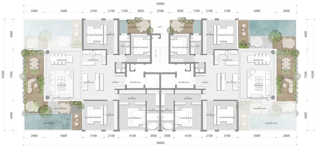 于是我们摒弃高低配,用不到10%的建筑密度,为园林公区留有了更多的可能性。