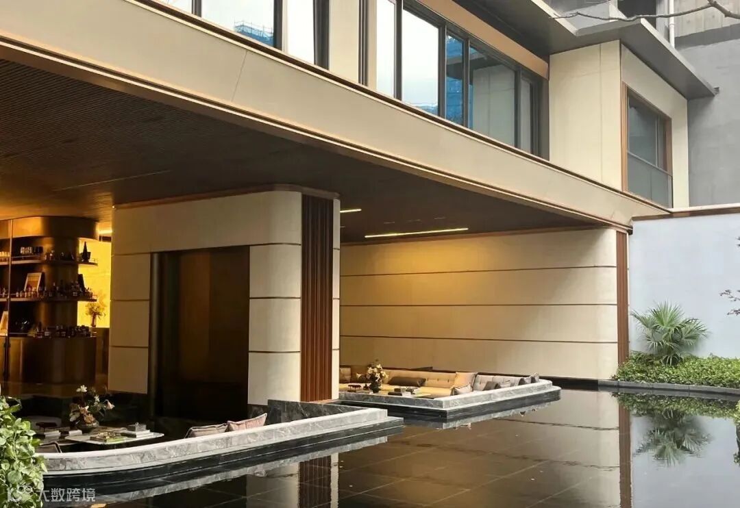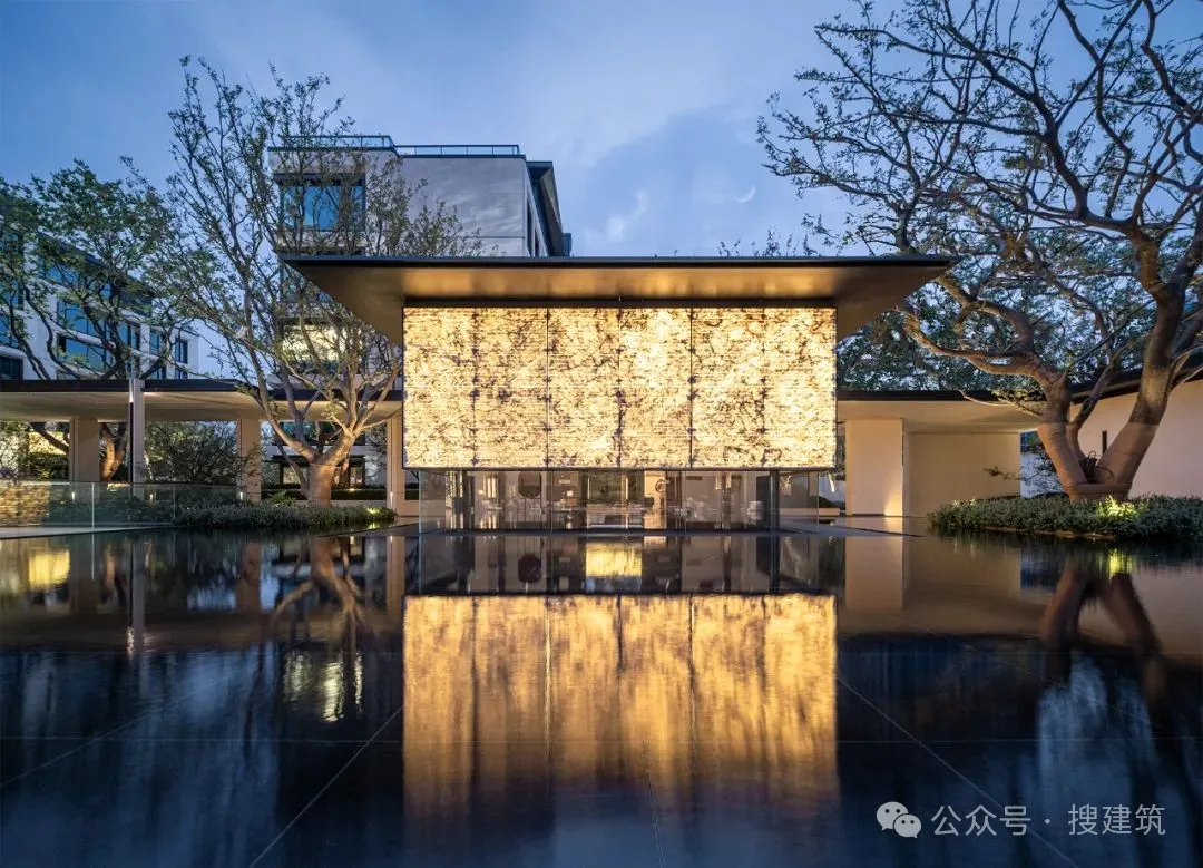 瞻月府的外立面一眼就惊艳,采用了进口葡米纯石材、仿铜铝板和整面玻璃打造,质感拉满。屋顶采用进口曼宁家深灰色陶瓦屋面,让建筑更加富有东方韵味。