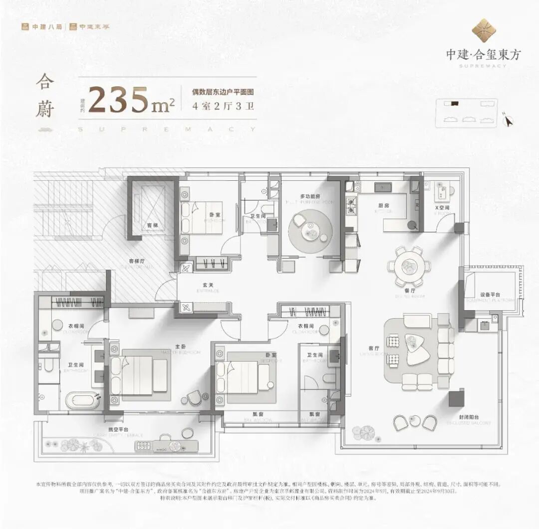 中建·合玺东方精心打造约190㎡、235㎡、268㎡三种高端大平层户型,均致力于纯粹的居住改善。项目采用独特的挑空平台设计,每户皆享有一方独立的立体“空中庭台”。