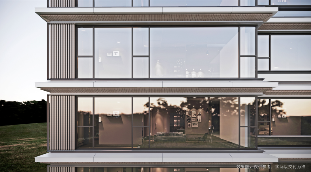 设计细节上,相较于传统建筑的处理方式,其独特的“四感融合”立面匠造工艺,精致感、细腻感十足,让建筑成为艺术。约0.48超大窗墙比,营造出建筑的轻盈、透亮和灵动感,IMAX级全景落地窗+270°转角窗,拉近了室内外的距离,带来宽幕无界的观景视野。