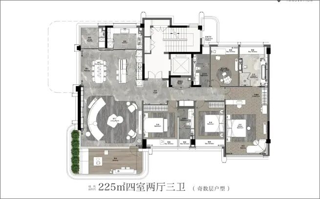 建面约220㎡四房两厅三卫户型:约8.5m横厅空间,人生阔境,由此而起。约11.8m跑道式奢阔阳台设计,将尺度感拉满。主卧套房配备270°转角飘窗,一城美景尽收眼底!