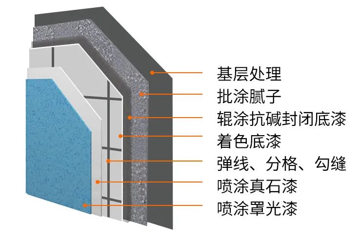 基层检测→校验阴阳角→基层找平→腻子批刮→打磨→分格子→喷涂底漆→基层修补→面漆喷涂