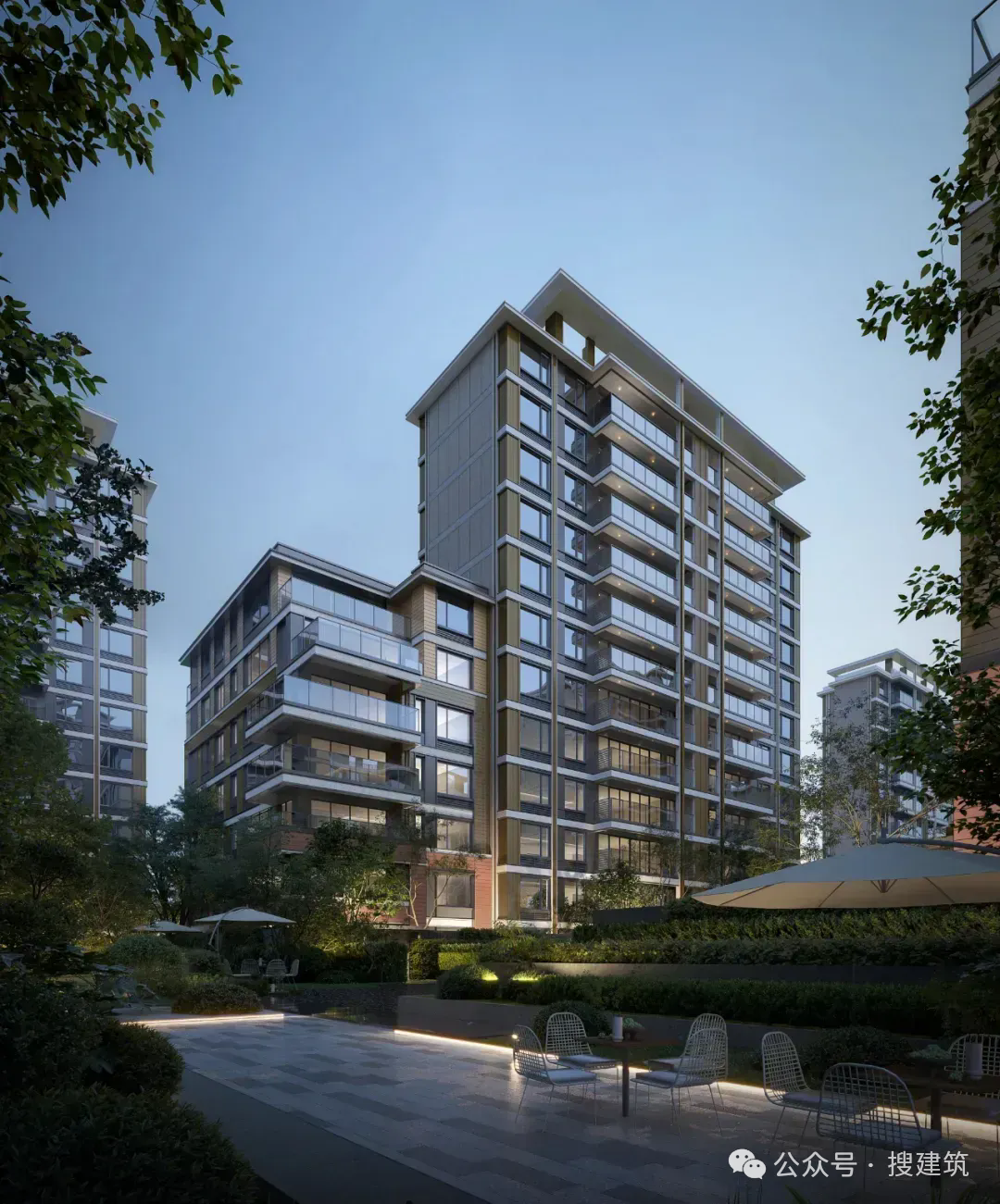 广州中海观澜府外立面采用类幕墙系统及定制化造型线条,呈现现代公建化新潮形象。主要由一体板附着金属漆和外挂槽钢、铝合金线条组成。
