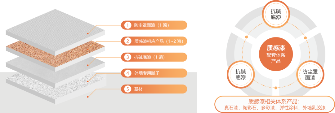该涂料具有天然石材的质感,是外墙干挂石材的替代品;同时该漆采用水性乳液,可用于水泥砖墙、泡沫、石膏等多种基面。