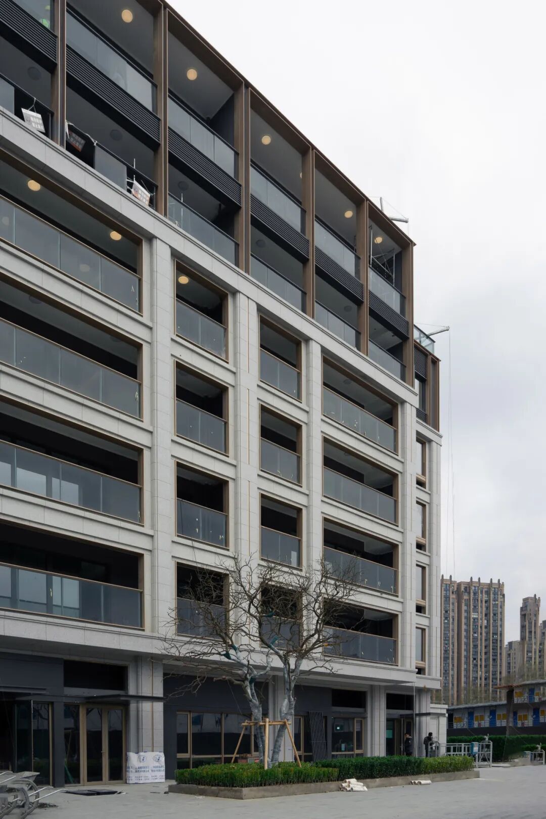 郑州保利·天汇立面以米白色真石漆与石材、灰色金属、水晶灰玻璃搭配,通过去除复杂的装饰构件与多余线脚,令设计立面设计最终呈现出一种简约而不简单的视觉效果,不仅赋予了建筑一种现代的秩序美,更在经典与现代之间找到了一种完美的平衡。