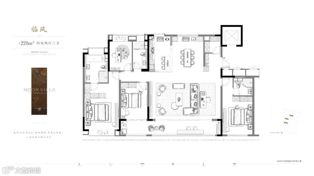 建面约220㎡四房两厅三卫户型:约8.5m横厅空间,人生阔境,由此而起。约11.8m跑道式奢阔阳台设计,将尺度感拉满。主卧套房配备270°转角飘窗,一城美景尽收眼底!