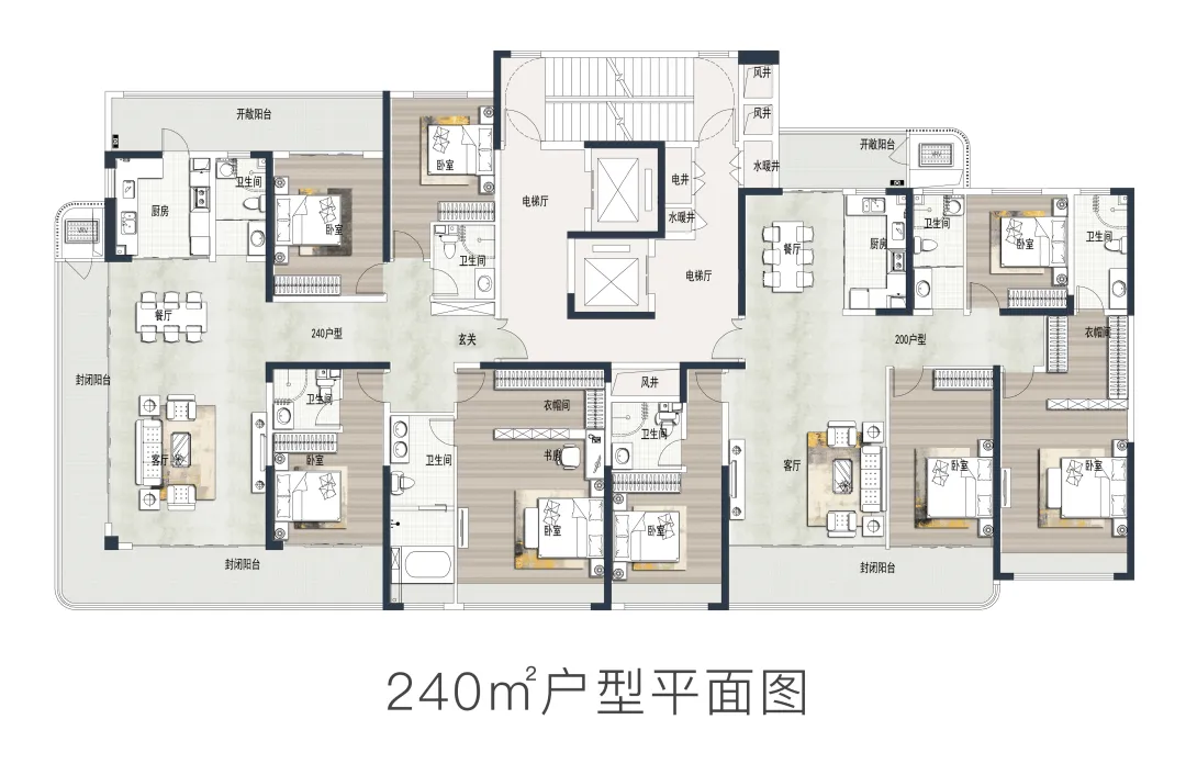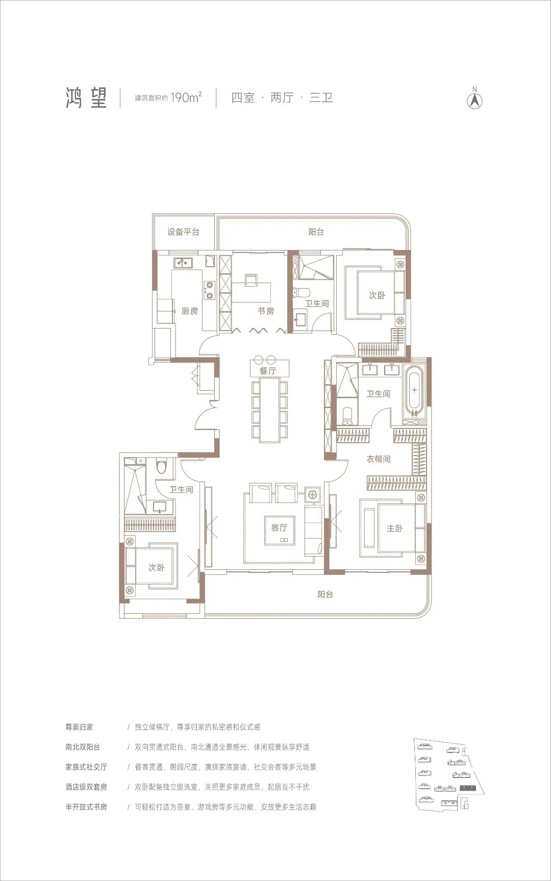 在项目景观视野最好的高层楼栋,户型设计为多面宽超大尺度南向布局,将景观优势最大化展现,提高户型的价值点和竞争力。