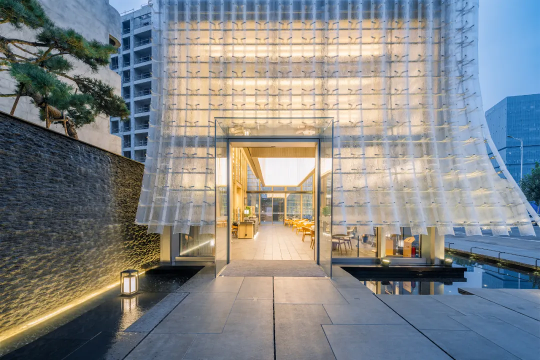 玉门内部,内藏精致木构,通过艺术形体重构一个木构建筑,营造出一个内有乾坤的空间体验。大堂包括长桌等候区、大堂服务区,灯光从木构缝隙中渗透出来,中心区域设置通高灯箱,加强大堂的仪式体验。