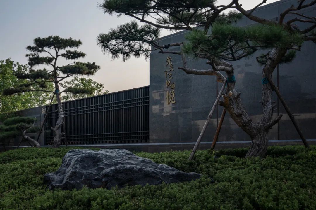 大门两侧的消防门蕴含中国人的含蓄之美,先见景后见门,入口与景观融为一体。门前的古松、山石、草坪犹如一块屏风,若隐若现。