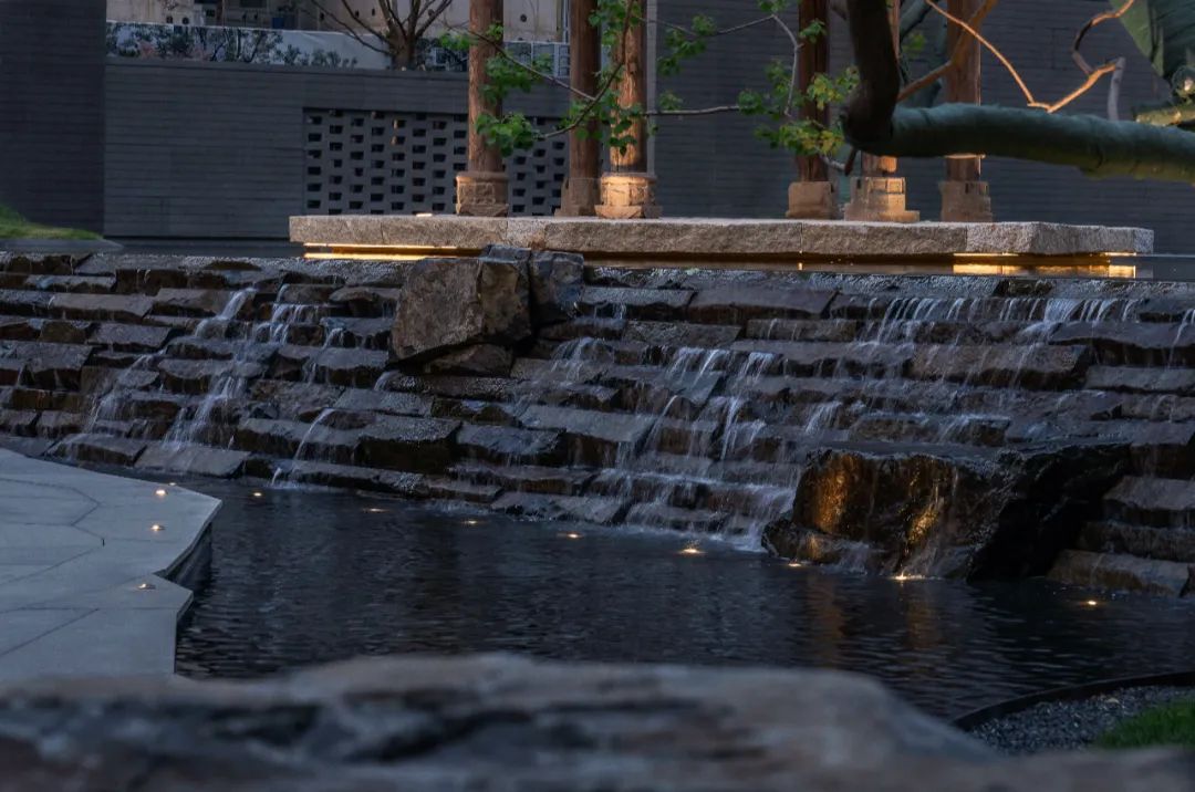 金沙壹号院大门口水系犹如一座漂浮在海洋上的小岛,是景观的一大亮点,富有质感及设计感的精致LOGO在水中静立,成为整个空间的视线焦点,也充分提升景观气质,延续艺术性的同时也烘托出了尊贵的气质。