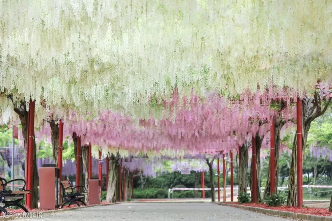 无数紫藤花朵紧密地簇拥在一起,形成了一片片各色的花海,超级梦幻~