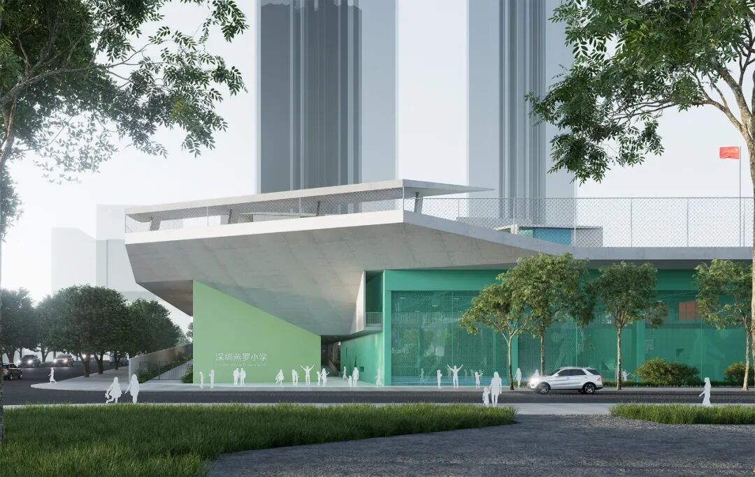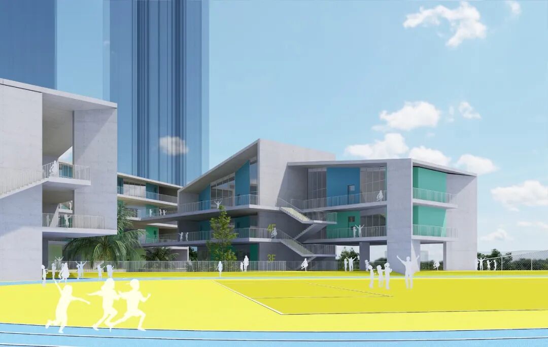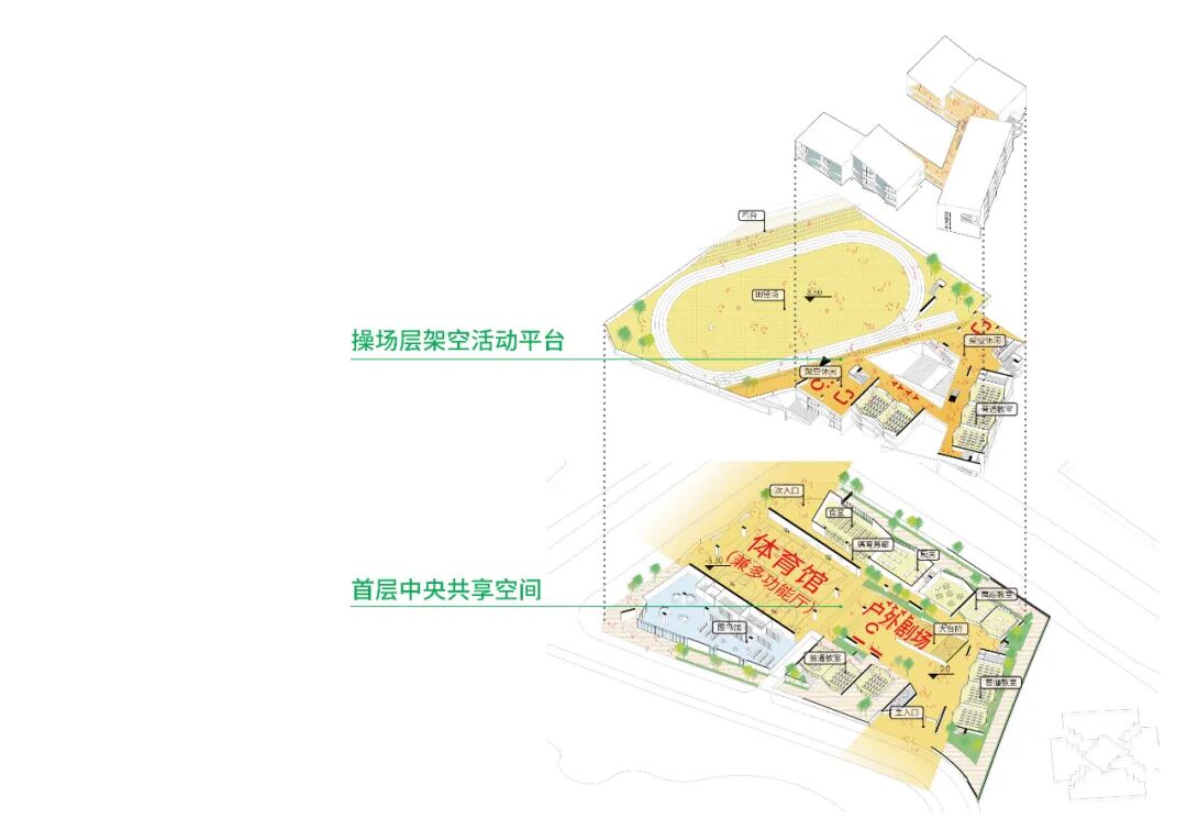 教学楼围绕西侧体育场形成东西轴半围合形式,共享中部公共活动场所;西北入口与东南主入口贯通,与公园及社区高效连接;轴线串联其各个教学功能,贯通的学习探索、艺术交流及运动生活等共享空间。