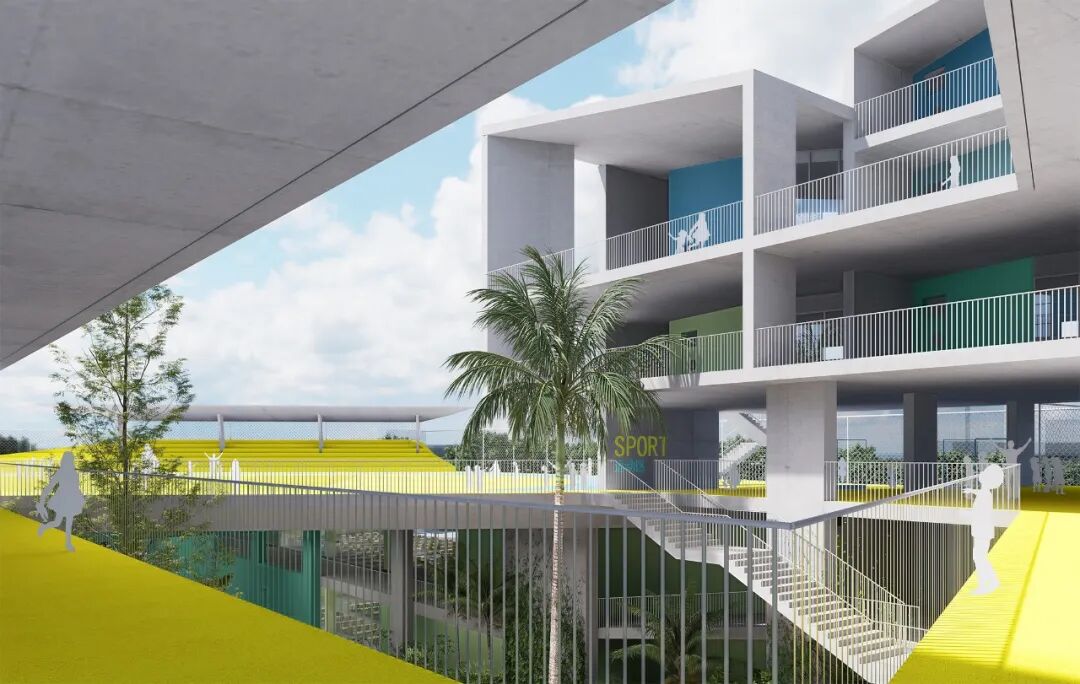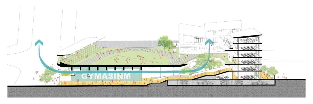 首层结合地势西低东高的趋势,创造多首层的入口平台和大架空的东西贯通活动空间,如架空体育馆及阶梯庭院室外剧场等;三层结合体育场创造丰富的架空活动及休闲场所,与公园形成面对面的对话。
