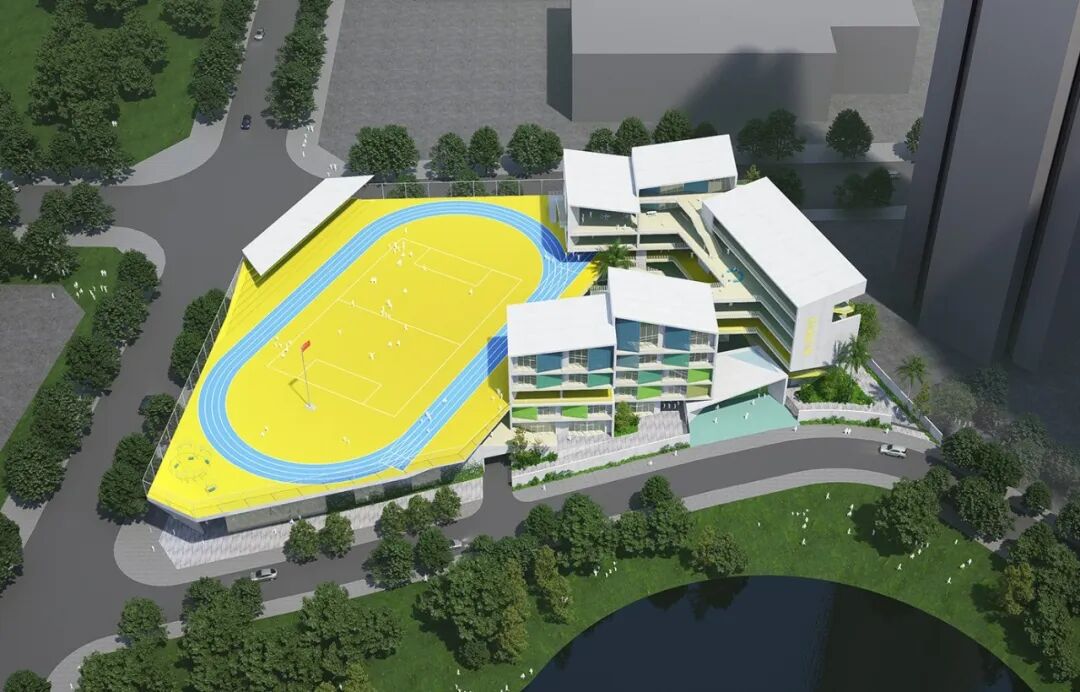 将运动区放置西侧,满足标准200M 及60M 直跑道需求;教学区放置东侧,降低道路噪音影响的同时,也拉通西北角公园与南面公园的景观通廊。