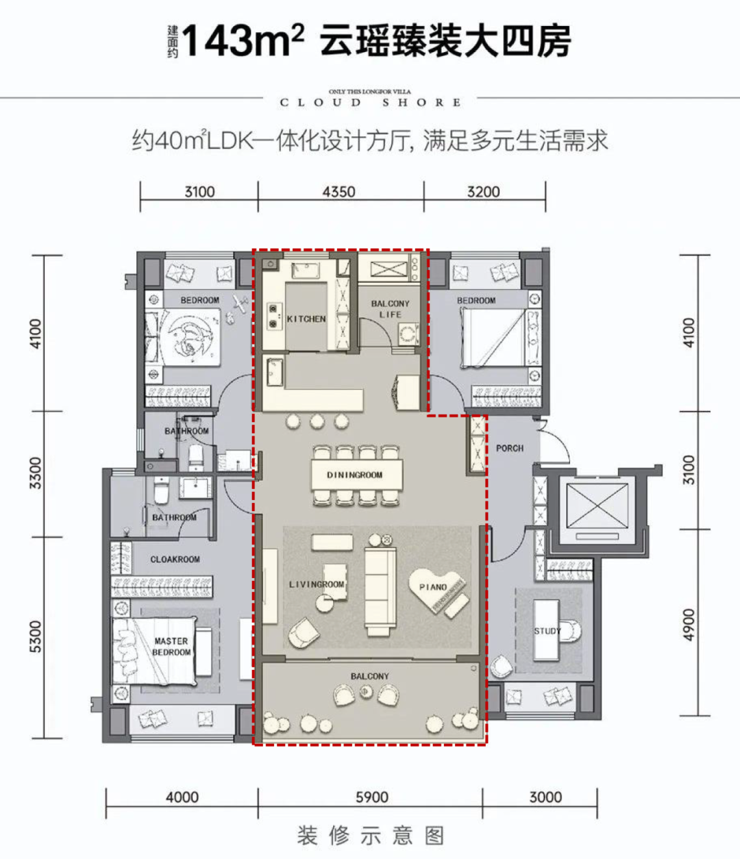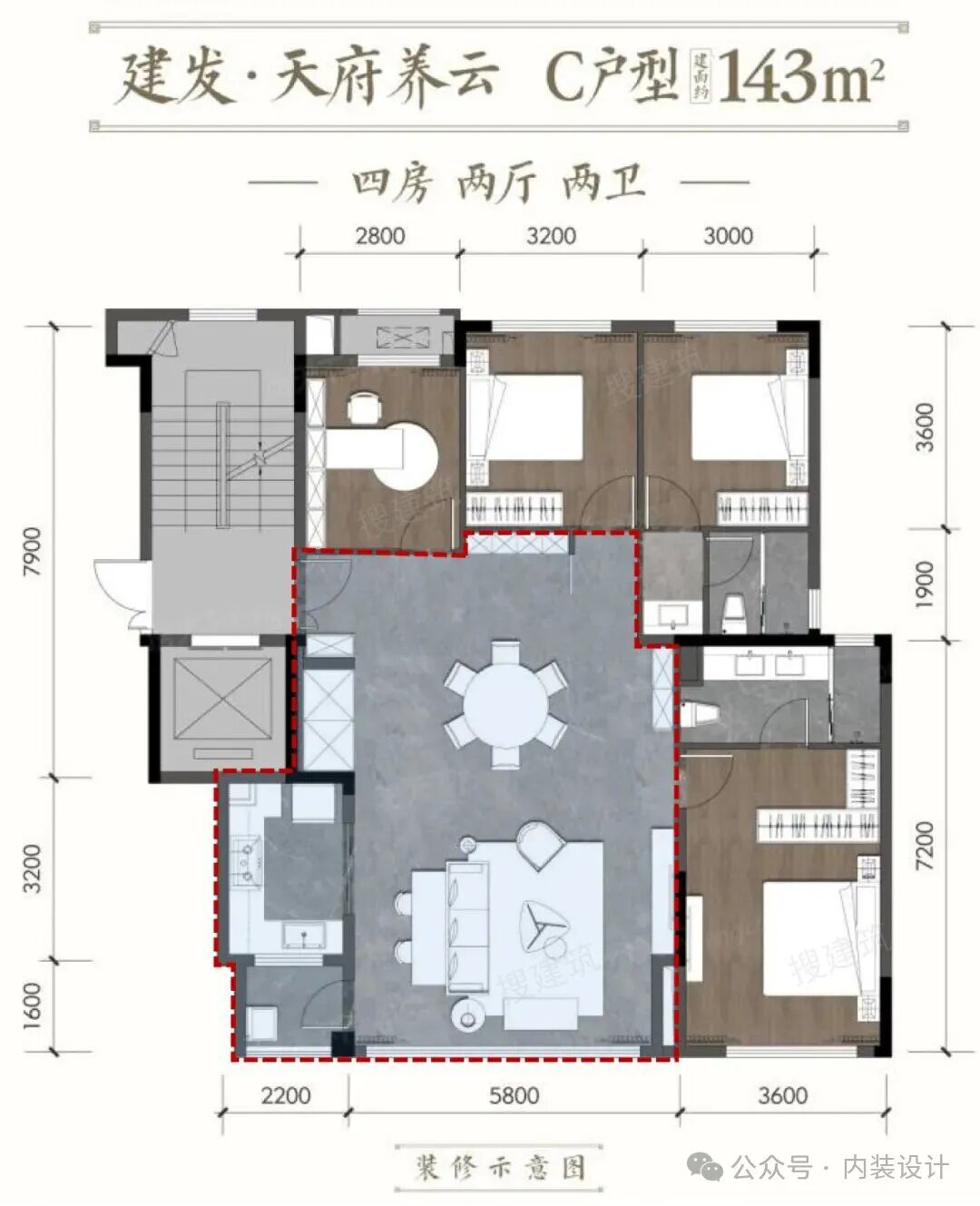 方厅143户型,4房2厅2卫,约13米开间,方厅41㎡,约9.5米甲板式阳台。