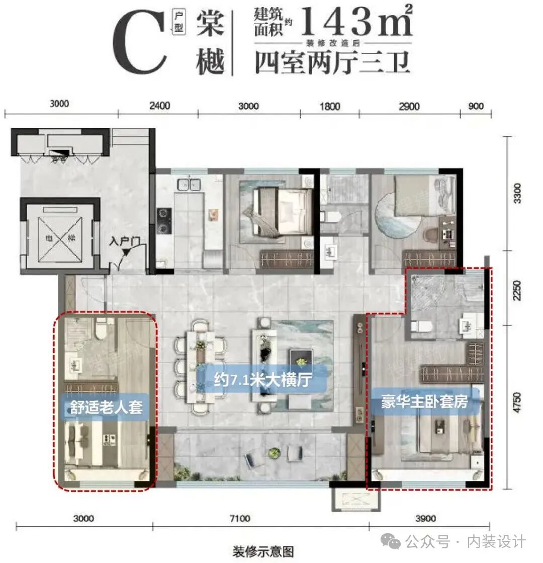 银川光耀和玺143㎡4室洋房,南向约14米超大面宽,南北通透,采用独立电梯厅入户设计,增加出行的舒适性、私密性和安全性。约7.1米大横厅设计连接同宽南向观景阳台。同样是双套房设计,让家人有更大、更独立的私密空间。