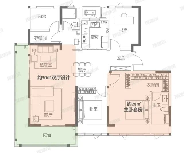 约6.6米情景阳台,尽量做大进深,可开拓多功能空间,容纳更多生活的可能性。约27㎡主卧套房,开间达到3.8米,配置女王更衣室、全景飘窗、独立卫浴等,丰富功能性、强化舒适性,全面覆盖男女主人的多样化居住需求。