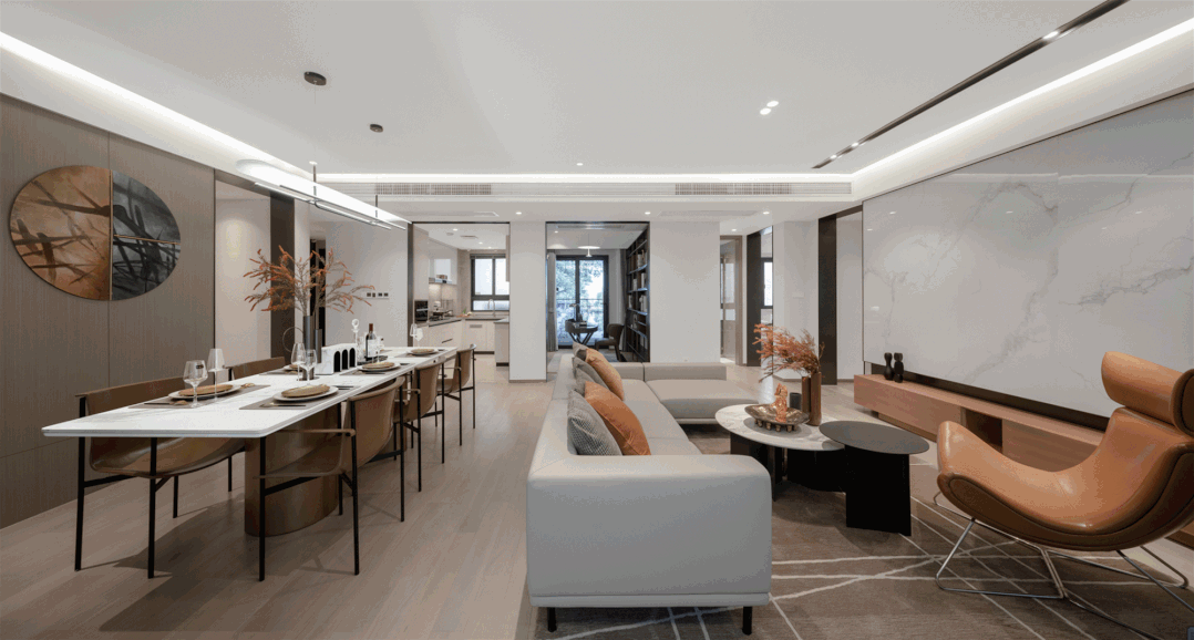 比如成都建发天府养云建面约143㎡户型,客厅与餐厅就是典型的竖厅布局,餐客厅面积约53㎡,竖厅也能做好一体化空间,而且更有利于做出更充分的收纳空间。