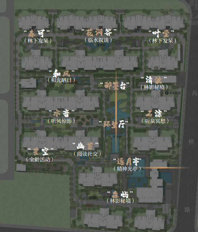 社区园林借鉴瞻园规划布局及手法,以“一环一轴”景观格局,根据场地特性和地块条件打造瞻月十二园——三大庭院空间+九大宅间名园,让建筑生长于园中。