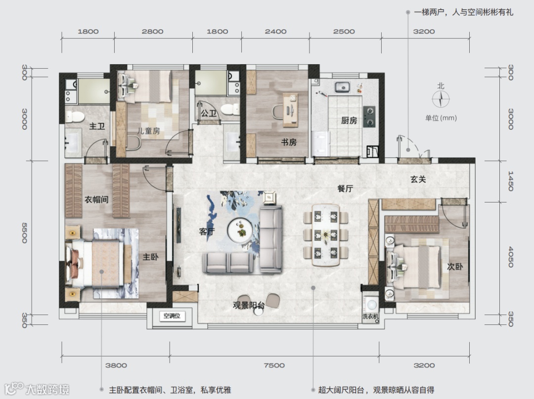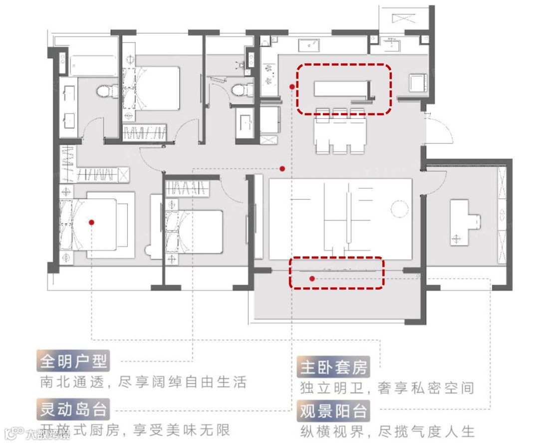 考虑到城市居住人群的生活习惯和居住体验,四开间朝南设计,南北双向阳台。南向主卧套房设计,配备独立卫浴、270°转角大飘窗,看书、阅读、观景、喝茶多种功能随心所至。