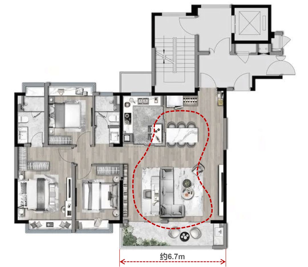 好的家庭空间设计,可以让一家人的目光,能够高频次的覆盖到公共生活空间,让家庭成员之间的交互和关系更紧密。